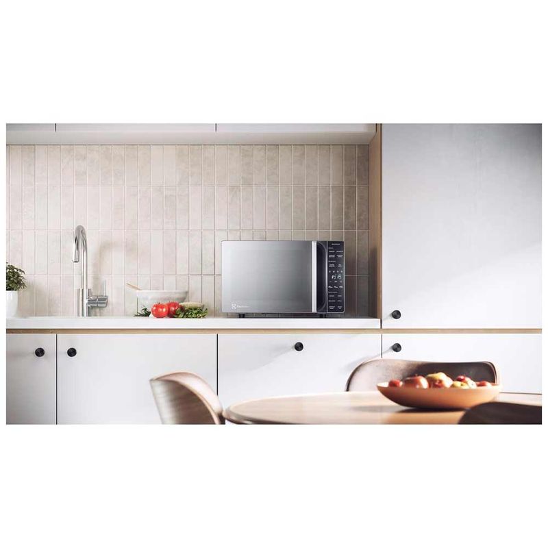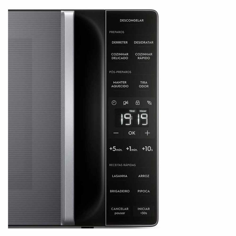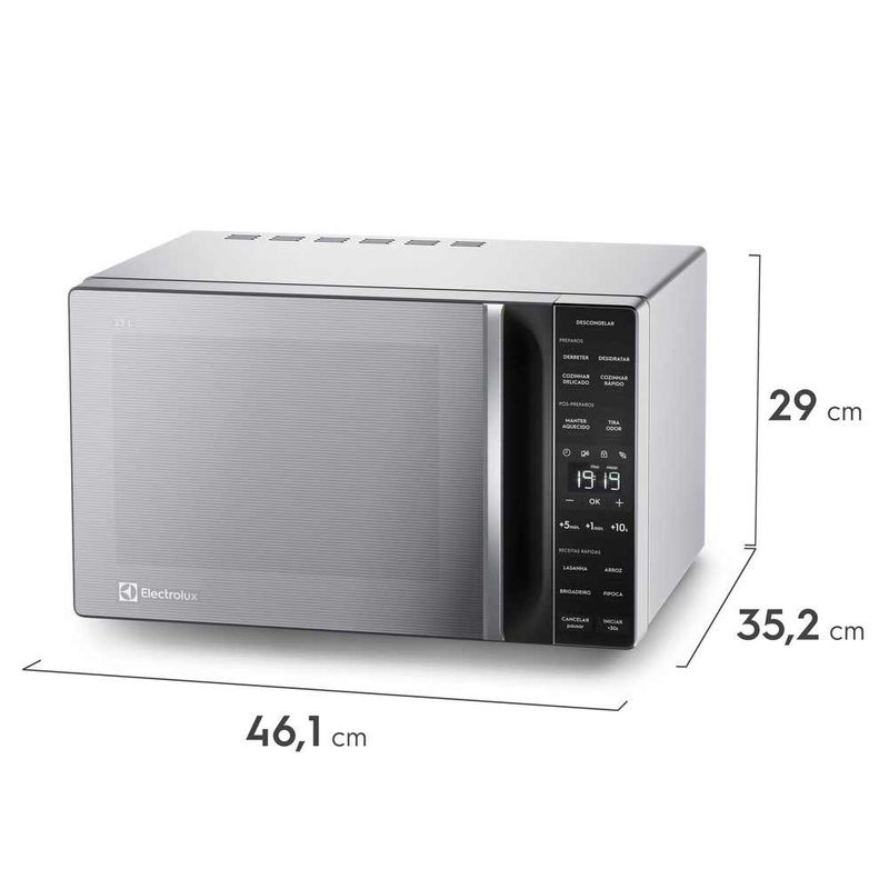 """Conheça o Micro-ondas Electrolux Prata 23L Efficient (ME23S), com a nova tecnologia de Descongelamento Assistido e um painel cheio de possibilidades para seu dia a dia.O Micro-ondas Electrolux Prata 23L Efficient (ME23S) é pensado para facilitar sua rotina na cozinha. Ele conta com a tecnologia de Descongelamento Assistido da Electrolux para alcançar resultados mais uniformes ao descongelar os ingredientes, avisando no painel o momento certo de virar ou mexer os alimentos.Seu painel inteligente, com ajustes automáticos de potência, disponibiliza quatro modos de preparo diferentes e funcionais para tornar sua rotina mais prática: derreter; desidratar; cozinhar rápido e cozinhar delicado.Acione a Função Desidratar para fazer chips de frutas ou vegetais, além de desidratar ervas para conservá-las por mais tempo. Selecione a Função Cozinhar Delicado se quiser preparar alimentos macios, como peixes e alguns tipos de vegetais. Para vegetais mais duros e carne bovina, utilize a Função Cozinhar Rápido.O Micro-ondas Electrolux possui a Função Manter Aquecido, que conserva suas receitas recém preparadas quentes e deliciosas até o consumo. A função Tira Odor é ideal para manter seu produto livre de possíveis odores dos preparos anteriores graças ao sistema de recirculação do ar interno.MetatagConheça o Micro-ondas Electrolux Prata 23L Efficient (ME23S), com a nova tecnologia de Descongelamento Assistido e um painel cheio de possibilidades para seu dia a dia:O Micro-ondas Electrolux Prata 23L Efficient (ME23S) é pensado para facilitar sua rotina na cozinha. Ele conta com a tecnologia de Descongelamento Assistido da Electrolux para alcançar resultados mais uniformes ao descongelar os ingredientes, avisando no painel o momento certo de virar ou mexer os alimentos.Seu painel inteligente, com ajustes automáticos de potência, disponibiliza quatro modos de preparo diferentes e funcionais para tornar sua rotina mais prática: derreter; desidratar; cozinhar rápido e cozinhar delicado.Acione a Função Desidratar para fazer chips de frutas ou vegetais, além de desidratar ervas para conservá-las por mais tempo. Selecione a Função Cozinhar Delicado se quiser preparar alimentos macios, como peixes e alguns tipos de vegetais. Para vegetais mais duros e carne bovina, utilize a Função Cozinhar Rápido.O Micro-ondas Electrolux possui a Função Manter Aquecido, que conserva suas receitas recém preparadas quentes e deliciosas até o consumo. A função Tira Odor é ideal para manter seu produto livre de possíveis odores dos preparos anteriores graças ao sistema de recirculação do ar interno.Destaques DerreterAlimentos derretidos no ponto certo. Ideal para manteiga e chocolate. DesidratarFaça chips de vegetais e frutas ou desidrate ervas para conservá-las. Cozinhar DelicadoPara alimentos que necessitam de cozimento suave, como vegetais macios e peixes. Cozinhar RápidoOferece agilidade no preparo de alimentos firmes, como carne bovina e legumes como batata. Descongelamento AssistidoIndica, por meio de um aviso sonoro e luminoso, o momento certo de virar ou mexer os alimentos, garantindo um resultado mais uniforme. Função Manter AquecidoGarante que seu prato fique aquecido até a hora do consumo para você aproveitar o melhor de cada refeição. Função Tira OdorO sistema de recirculação do ar interior suaviza os odores deixados por preparos anteriores e mantém o micro-ondas sempre pronto para a próxima receita. Quatro Receitas Pré-ProgramadasOferece a facilidade que sua rotina merece. Com apenas um toque, faça pratos conhecidos: lasanha, arroz, brigadeiro e pipoca. Função Economia de EnergiaDesliga as luzes do painel quando o micro-ondas não está em uso. Oferece classificação energética A, sendo econômico para o dia a dia Função Trava-PainelGarante que o painel não seja acionado ou alterado indevidamente por crianças, por exemplo, e impede que os comandos sejam acionados durante a limpeza do painel. Função MudoConfigure seu micro-ondas para não emitir som durante o uso e mantenha o ambiente silencioso sempre que quiser. Função Limpa FácilFacilita a remoção de gorduras e respingos provocadas pelo uso. QR CodeVocê pode acessar mais detalhes sobre os benefícios do seu produto na palma de sua mão. 1100W para suas receitasPotência ideal para diversos tipos de preparos.CaracterísticasTipo: MesaPainel EletrônicoPratos Pré-programados: Lasanha, arroz, brigadeiro e pipocaEspecificações TécnicasModelo: ME23SCor: PrataCor do Display: BrancoCapacidade Total: 23 litrosCapacidade Útil: 12 litrosPotência: 1100WSelo Procel (Eficiência Energética): AAcabamento Cor da Cavidade: Pintado BrancoAcabamento Porta: Vidro e PlásticoPorta EspelhadaPrato GiratórioLuz InternaVoltagem: 110V / 220V (não é bivolt)EAN: 7909569410301 (110V) / 7909569410318 (220V)Garantia: 12 mesesDimensões e PesoDimensões do produto sem embalagem (AxLxP): 290x461x352 mmDimensões do produto com embalagem (AxLxP): 308x487x371 mmPeso do produto sem embalagem: 11,50 KgPeso do produto com embalagem: 11,70 KgItens Inclusos01 Microondas01 Manual de Instruções"""