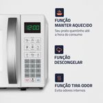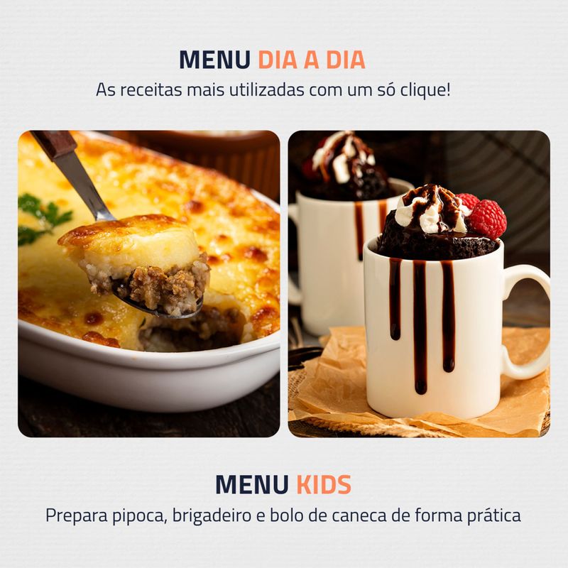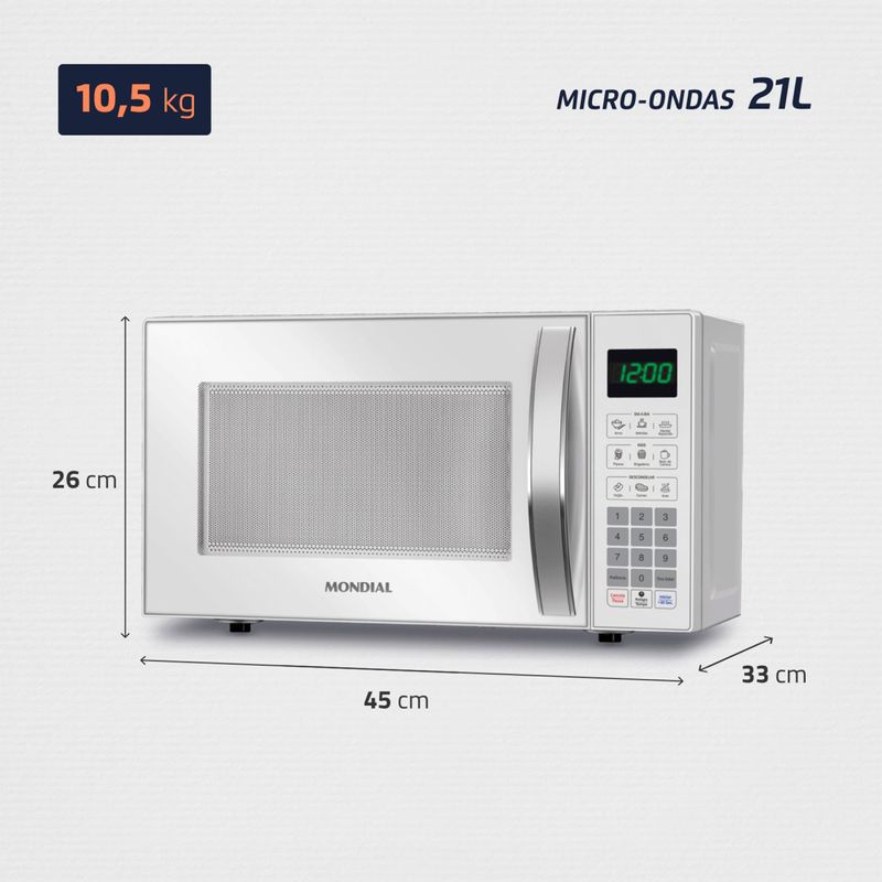 O Micro-ondas Branco da Mondial é sofisticado, eficiente e possui funções que facilitam sua vida na cozinha! Tem capacidade de 21 litros, 1.200W de potência, Display Digital e funções como Menu Dia a Dia, que oferece opções rápidas para refeições cotidianas, e Menu Kids, com receitas especiais para crianças. Descubra todas as funcionalidades do MO-01-21-W e transforme sua rotina! CAPACIDADE DE 21 LITROS: Oferece a flexibilidade necessária para cozinhar, aquecer e descongelar uma variedade de pratos, desde refeições rápidas até pratos mais complexos. POTÊNCIA DE 1.200W: Com alta potência, você prepara e descongela seus alimentos com mais rapidez e eficiência, facilitando sua rotina diária. MENU DIA A DIA: Prepare as receitas que você mais usa com apenas um clique, otimizando seu tempo. FUNÇÃO DESCONGELAR: A praticidade de descongelar alimentos de forma rápida e fácil, com apenas um toque. FUNÇÃO MANTER AQUECIDO: Mantém seu prato na temperatura ideal até o momento de servir, garantindo sempre uma refeição quente e saborosa. MENU KIDS: Prepare facilmente as receitas que as crianças adoram, como pipoca, brigadeiro e bolo de caneca. A hora do lanche vai ficar divertida e deliciosa! 10 AJUSTES DE POTÊNCIA: Com 10 níveis de potência, você pode ajustar facilmente a intensidade para cozinhar, aquecer ou descongelar seus alimentos de forma eficiente. FUNÇÃO TIRA ODOR: Mantenha seu forno micro-ondas limpo por mais tempo, eliminando os odores indesejados das refeições anteriores. TRAVA DE SEGURANÇA: A função de trava de segurança proporciona tranquilidade, impedindo que as crianças utilizem o micro-ondas sem supervisão. DESIGN COMPACTO: Sua cozinha fica organizada com o micro-ondas da Mondial, que ocupa menos espaço sobre a bancada, armário embutido ou em suportes. EFICIENCIA ENERGÉTICA: Baixo consumo de energia: selo com classificação A de economia. QR CODE DE RECEITAS MONDIAL: O QR Code vem no próprio aparelho e possibilita que você acesse diversas receitas práticas e deliciosas para serem feitas no micro-ondas. UM ANO DE GARANTIA MONDIAL: A Mondial é a escolha de milhões de consumidores. Mondial, a escolha inteligente!
