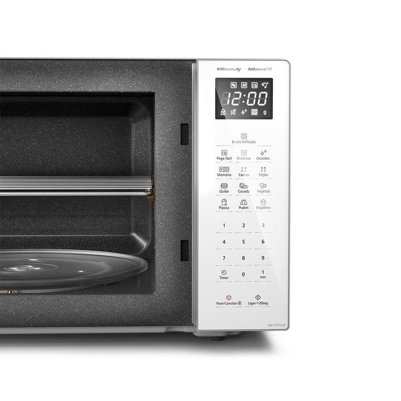 Micro-ondas Panasonic 34L Branco NN-ST65LWRUMicro-ondas Panasonic 34L Branco NN-ST65LWRUEspecificaçõesMarca: PANASONICModelo: PANASONICCor: BrancoAntiaderente: SimAuto Descongelamento: SimPotência (W): 900AtributosProdutoERP: Denominação: Forno, Tipo: de Micro-ondas, Marca/Submarca: PANASONIC, Cor: Branco, Capacidade: 34L, Referência: Ref.: ST65LSRUKConteúdo da Embalagem: 01 Micro-ondas + 01 Prato Giratório + 01 Grelha Suporte + 01 Manual de InstruçõesTecla mudo: SimTecla potência/porções: SimAltura (cm): 32,5SAC: 0800-776-0000 e 4004-6600Largura (cm): 52,0Peso (kg): 14,8Trava de segurança: SimComprimento (cm): 43,2Modelo: NN-ST65LWRUCapacidade Total de Armazenamento (L): De 31L à 40LTipo de Produto: BancadaTecla início + 30s: SimPrato giratório: SimSKU: 220V: 4631868 | 127V: 4631895Níveis de potência: 10Relógio: SimDescriçãoO Micro-ondas Panasonic 34L Branco NN-ST65LWRU é perfeito para facilitar o seu dia a dia na cozinha. Com sua potência de 900W, você poderá preparar suas refeições de forma rápida e eficiente. Seu design moderno e elegante, na cor branca, combina com qualquer estilo de decoração.O micro-ondas possui capacidade de 34 litros, oferecendo espaço suficiente para preparar grandes porções de alimentos. Além disso, conta com a função de auto descongelamento, permitindo que você descongele seus alimentos de forma prática e rápida.Com 10 níveis de potência, o Micro-ondas Panasonic NN-ST65LWRU oferece um controle preciso na hora de cozinhar seus alimentos. Seu prato giratório garante um aquecimento uniforme, evitando que seus alimentos fiquem frios em algumas partes.Com a tecla início + 30s, você pode adicionar 30 segundos extras ao tempo de cozimento com apenas um toque. Já a tecla mudo permite que você desligue os sons do micro-ondas, ideal para ambientes mais silenciosos.O Micro-ondas Panasonic NN-ST65LWRU possui um sistema de trava de segurança, garantindo a proteção de crianças e evitando acidentes. Além disso, conta com um relógio digital, facilitando o controle do tempo de cozimento.
