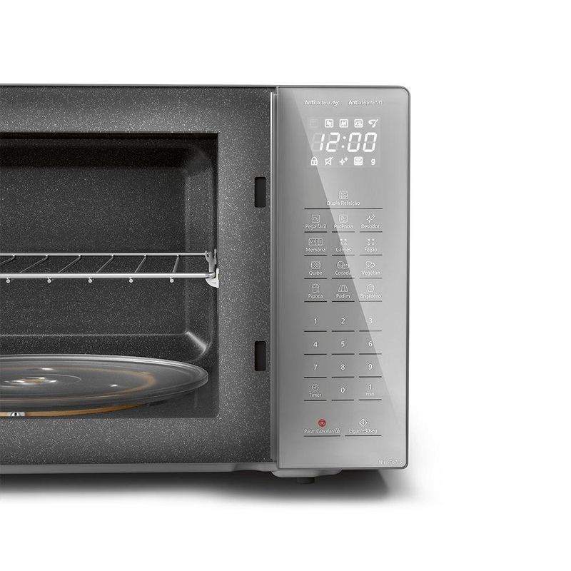 Micro-ondas Panasonic Tecnologia Antibactéria AG 34L Inox - ST67LSRU 220VO micro-ondas Panasonic ST67LSRU é a solução ideal para quem busca eficiência e modernidade na cozinha. Com a tecnologia Antibactéria e recursos práticos como Dupla Refeição e Pega Fácil, ele oferece um desempenho superior e facilidade na limpeza, tornando o preparo de refeições mais rápido e seguro.Recursos:Antibactéria AG: Inibe 99,9% da proliferação de bactérias.Dupla Refeição: Permite aquecer duas porções simultaneamente com grelha removível.Pega Fácil: Facilita a remoção de utensílios quentes.Revestimento Antiaderente: 4x mais fácil de limpar.Autodescongelamento: 2 opções disponíveis.Desodorizador: Elimina odores de receitas anteriores.Funções Adicionais:Relógio: SimTrava de Segurança: SimAdicionar 30 seg.: SimTipo: Micro-ondas com Tecnologia Antibactéria AGCapacidade: 34LCor: InoxPotência de Entrada (Micro-ondas): 900 WNíveis de Potência (Micro-ondas): 10Largura sem Embalagem: 52 cmAltura sem Embalagem: 32,5 cmProfundidade sem Embalagem: 43,2 cmPeso Líquido: 14,8 kgPeso Bruto: 15,7 kgInterior: CinzaPorta: EspelhadaGarantia: 12 meses