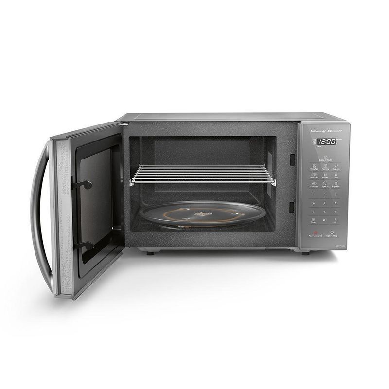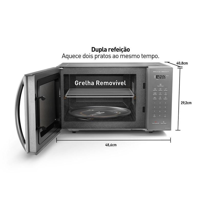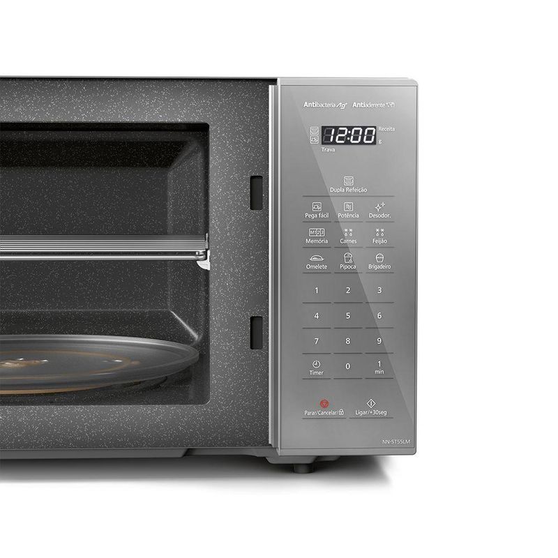 Micro-ondas Panasonic Dupla Refeição 27L Prata - ST55LMRU 220VO micro-ondas Panasonic ST55LMRU é ideal para quem busca praticidade e eficiência. Com a função Dupla Refeição, você pode aquecer dois pratos simultaneamente, enquanto suas tecnologias facilitam o uso e a limpeza. O design moderno e sofisticado complementa qualquer cozinha.Recursos:Dupla Refeição: Aquece duas porções simultaneamente (300g, 500g e 700g).Pega Fácil: Facilita a remoção de utensílios quentes após o aquecimento.Tecnologia Antibacteria AG: Inibe 99,9% das bactérias.Revestimento Antiaderente: 4x mais fácil de limpar.Autodescongelamento: 2 opções disponíveis.Funções Adicionais:Relógio: SimTrava de segurança: SimAdicionar 30 seg.: SimFunção Mudo: NãoTipo: Micro-ondas com Dupla RefeiçãoCapacidade: 27LCor: PrataPotência de Entrada (Micro-ondas): 800 WNíveis de Potência (Micro-ondas): 10Potência de Entrada (Convecção): 1270 WClassificação: AEficiência Energética (%): 54,1Largura sem Embalagem: 48,5 cmAltura sem Embalagem: 29,1 cmProfundidade sem Embalagem: 40,3 cmPeso Líquido: 12,9 kgPeso Bruto: 13,2 kgGrelha suporte: SimGarantia: 12 meses