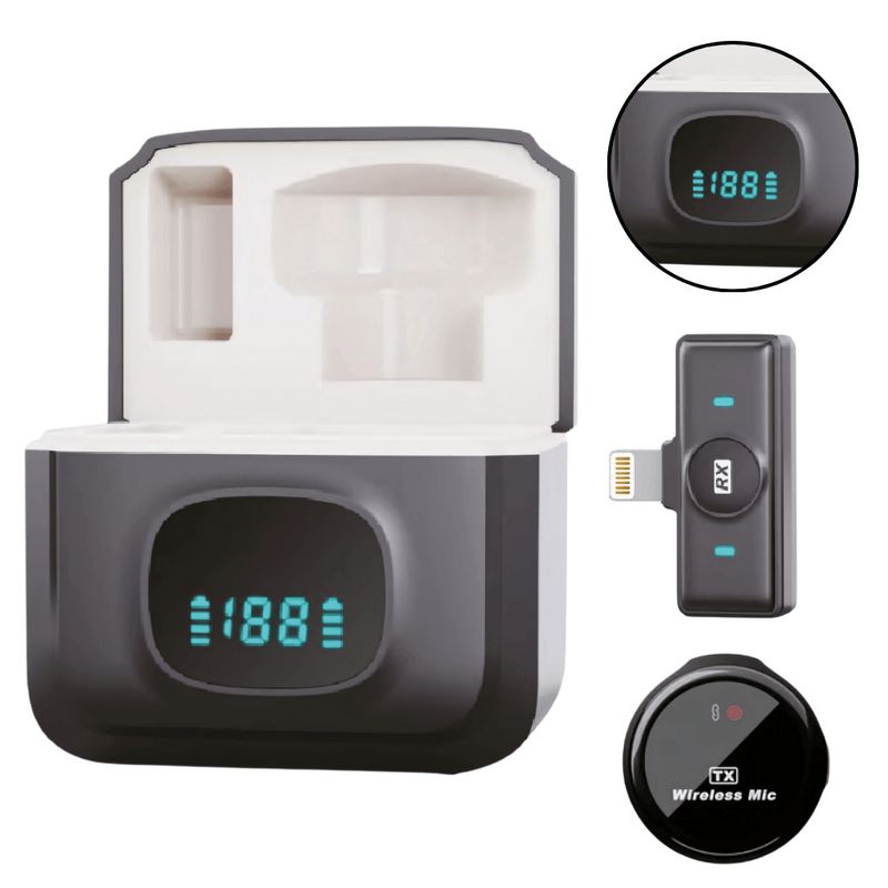 O microfone sem fio de lapela garante captação de áudio clara e estável, ideal para gravações, transmissões ao vivo, entrevistas e produção de conteúdo digital. Compacto e fácil de usar, acompanha receptor e estojo de carregamento com display digital. Componentes do Produto: Transmissor (TX): Microfone de lapela sem fio com captação omnidirecional, botão de emparelhamento e LED indicador de status Receptor (RX): Dispositivo compacto com conector 8 pinos, compatível com smartphones e tablets. Possui LED de pareamento Case de Carregamento: Estojo portátil com display digital que indica carga da bateria, com compartimento moldado para proteção dos dispositivos Especificações Técnicas: Conectividade: Sem fio, digital Alcance de Transmissão: Até 20 metros Captação de Áudio: Microfone omnidirecional de alta sensibilidade Compatibilidade: Dispositivos com porta USB-C Carregamento: Via estojo com bateria interna recarregável Display do Estojo: Indicador LED digital para carga da bateria