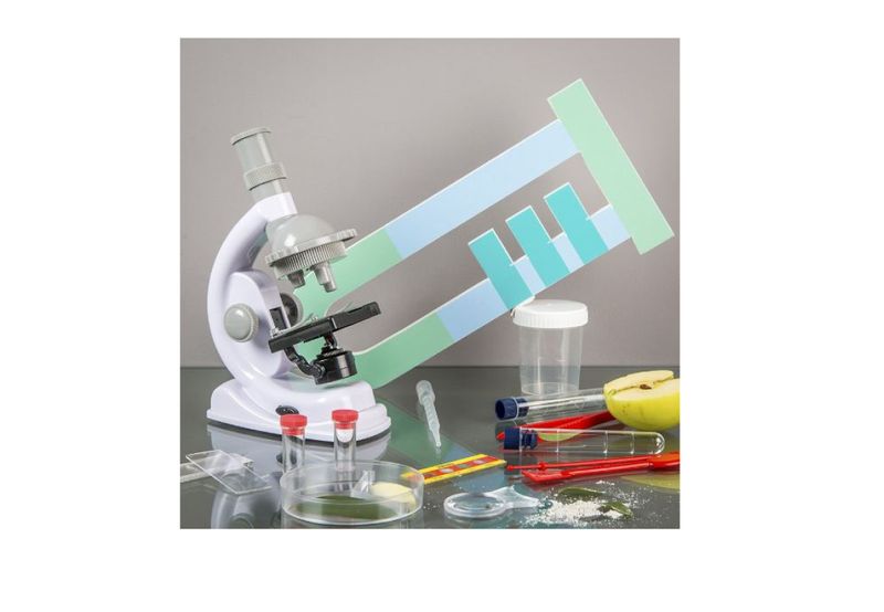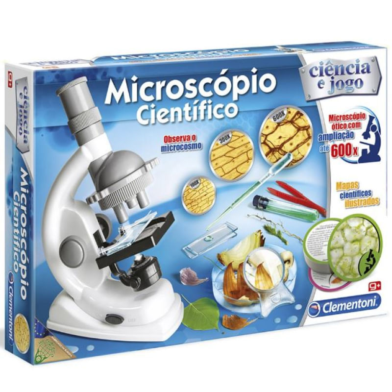 Microscópio Científico Um microscópio real e fascinante de fácil utilização com uma potência de aumento até 600x.Com os instrumentos necessários para as crianças observarem o mundo à sua volta: óculos, pipetas, lâminas de plástico, frascos de plástico.Mais de 55 testes e exercícios específicos.Com cartões identificativos dos insetos e as suas características.Requer 2 pilhas AA 1,5.