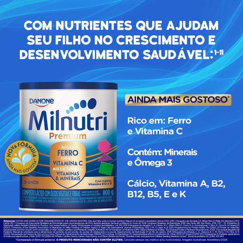 Composto Lácteo Milnutri Premium 800g Milnutri Premium é um composto lácteo desenvolvido especialmente para as necessidades nutricionais de crianças a partir de 3 anos. Seus nutrientes contribuem para o crescimento, o desenvolvimento cognitivo e a imunidade.?É rico em ferro, além de ser fonte de cálcio, vitaminas C, D e B12. Sua composição apresenta ômega 3, que auxilia no desenvolvimento cognitivo, além de ser rico em Ferro e ter um mix de vitaminas e minerais que auxiliam no desenvolvimento global. Sua fórmula também possui fibras prebióticas que contribuem para a regularização do hábito intestinal e pode contribuir para a imunidade. Vem no formato em pó em uma lata com 800g.Milnutri Premium não é leite em pó. É um composto lácteo com óleos vegetais e fibras. Este produto não deve ser usado para alimentar crianças menores de 1 (um) ano de idade.O aleitamento materno evita infecções e alergias e é recomendado até os 2 (dois) anos de idade ou mais. Características Rico em ferro Fonte de vitamina C Mix exclusivo de vitaminas & minerais Com cálcio, Vitamina B12 e D Nova fórmula, ainda mais gostosa Modo de Preparo Lave as mãos antes do preparo e utilize somente utensílios limpos e secos. Junte 6 colheres-medida ou 3 colheres de sopa cheias (30g) de Milnutri Profutura com 180ml de água morna ou fria e misture até que o pó se dissolva. Ingredientes Sólidos do leite parcialmente desnatado, Lactose, Óleos vegetais (óleo de canola, óleo de coco, óleo de girassol alto oleico, óleo de girassol, óleo de palma), Concentrado proteico do soro de leite, Maltodextrina, Galacto-oligossacarídeos (GOS), Fruto-oligossacarídeos (FOS), Óleo de peixe, Cálcio (carbonato de cálcio), Vitamina C (ácido L-ascórbico, L-ascorbato de sódio, palmitato de ascorbila), Ferro (sulfato ferroso), Inositol (mio-inositol), Zinco (Sulfato de zinco), Vitamina E (DL- alfa- tocoferol, acetato de DL-alfa tocoferila), Colina (cloreto de colina), Vitamina B5 (D-pantotenato de cálcio), Niacina (nicotinamida), Cobre (gluconato cúprico), Vitamina A (palmitato de retinila), Vitamina D (colecalciferol), Vitamina B1 (Cloridrato de Cloreto de Tiamina), Vitamina B2 (riboflavina), Vitamina B6 (cloridrato de piridoxina), Manganês (sulfato de manganês (II)), Ácido fólico (Ácido N-pteroil-L glutâmico), Vitamina K (fitomenadiona), Selênio (selenito de sódio), Vitamina B12 (cianocobalamina), Biotina (D-biotina), Aromatizante, Emulsificante lecitina de soja. Alérgicos: contém lactose, leite, soro de leite e derivados de leite, soja e peixe. Não contém glúten. O MINISTÉRIO DA SAÚDE INFORMA: O ALEITAMENTO MATERNO EVITA INFECÇÕES E ALERGIAS E É RECOMENDADO ATÉ OS 2 (DOIS) ANOS DE IDADE OU MAIS.? Informação Nutricional Porção de 30g (6 Colheres) ITEM QTDE. POR PORÇÃO VALORES DIÁRIOS Iodo 24mcg 19 Ácido docosahexaenóico 0,03g *** Gorduras monoinsaturadas 2,4g *** Valor energético 139kcal 7 Cobre 84mcg 9 Selênio 4,7mcg 14 Ácido alfa-linolênico 0,2g Vitamina B12 0,51g 21 Ácido alfa-linolênico VD *** Zinco 1,8mg 26 Sódio 72mg 3 Carboidratos 16g 5 ácido oléico VD ** Ácido linoléico 1,1g *** Fósforo 99mg 14 Cálcio 153mg 15 Proteínas 4,1g 5 ácido oléico 2,3g Gorduras trans 0 *** Biotina 3,7mcg 12 Vitamina B1 0,10mg 9 Magnésio 13mg 5 Ferro 2,8mg Gorduras poliinsaturadas 1,3g *** Gorduras saturadas 2,5g 12 Vitamina B6 0,08mg 6 Vitamina B2 0,22mg 17 Vitamina B5 0,75mg 15 Vitamina K 10mcg 16 Ácido fólico 23mcg 9 Fibra alimentar 1,6g 6 Gorduras totais 6,4g,das quias: 12 Vitamina C 29mg 63 Vitamina A 133mcg RE 22 Vitamina E 2,2mg 22 Vitamina D 4,1mcg 81