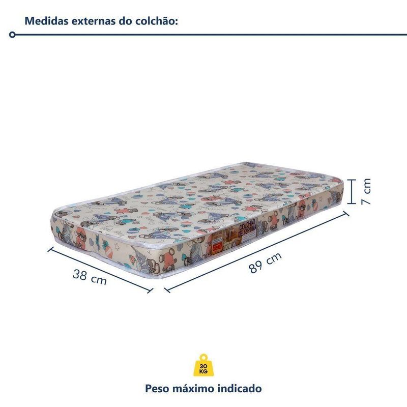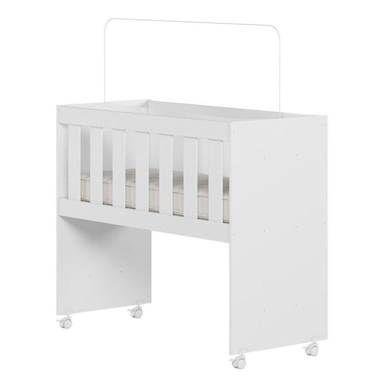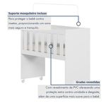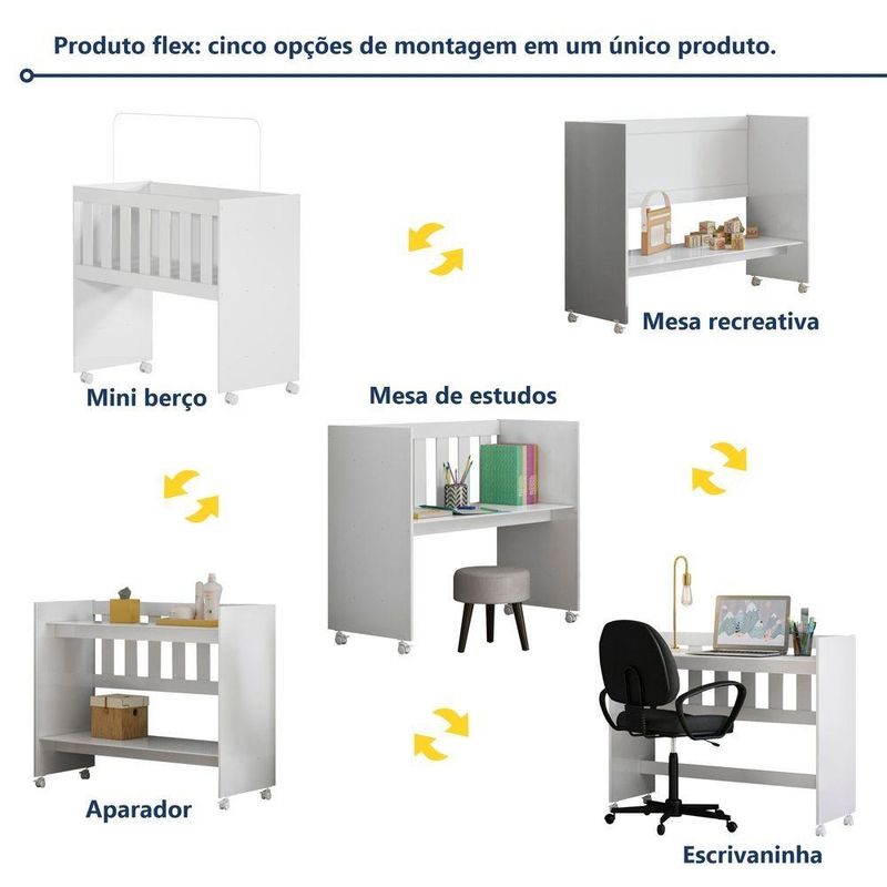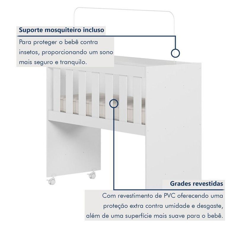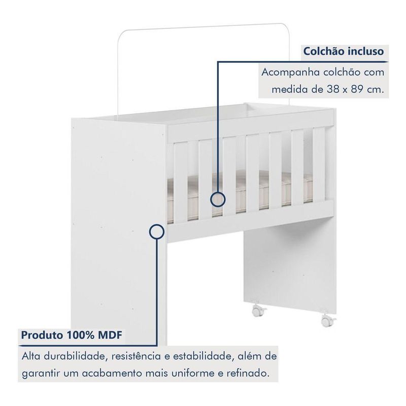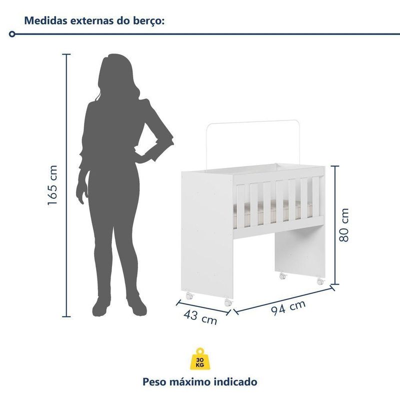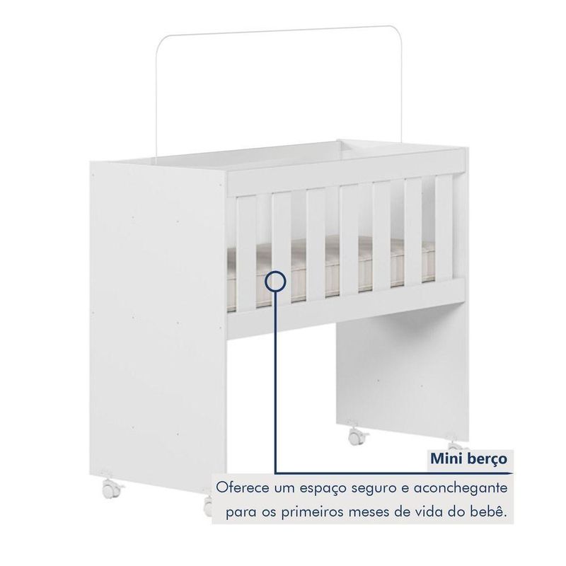 Mini Berço Com Colchão E Suporte Mosquiteiro 5 Em 1 Rubi 100% Mdf BrancoMini Berço 100% MDF com Colchão 5 em 1 Rubi – Lojas CuritibanasVersatilidade, Segurança e Conforto em um Único MóvelO Mini Berço Rubi 5 em 1 das Lojas Curitibanas é a solução inteligente e funcional para o primeiro quarto do bebê. Fabricado em 100% MDF, ele une alta durabilidade com um design moderno e compacto, ideal para manter o recém-nascido sempre por perto nos primeiros meses.Seu grande diferencial é o conceito Multifunção Flex, que permite a transformação do móvel em 5 fases diferentes, acompanhando o crescimento da criança e as necessidades da casa: Miniberço, Mesa de Recreação, Mesa de Estudos, Aparador e Escrivaninha. Além disso, o conjunto já acompanha o colchão adequado e suporte para mosquiteiro, garantindo o melhor custo-benefício.Principais Benefícios (Diferenciais):Móvel 5 em 1: Versatilidade total, transformando-se de miniberço para mesa de estudos ou aparador.100% MDF: Estrutura robusta com acabamento em pintura UV acetinada de alta qualidade.Mobilidade e Segurança: Possui rodízios com trava, facilitando o deslocamento entre os cômodos com total estabilidade.Saúde e Proteção: Pintura atóxica segura para o bebê e acompanha suporte para mosquiteiro (sem véu).Conjunto Completo: Já inclui colchão com densidade D-18, proporcionando o suporte ideal para um sono tranquilo.Ficha Técnica DetalhadaProduto: Mini Berço MultifuncionalModelo: Rubi (5 em 1)Marca: Tigus BabyAltura: 80 cmLargura: 94 cmProfundidade: 43 cmPeso Suportado: Até 30 kgMaterial Principal: 100% MDFAcabamento: Pintura UV Atóxica (Acetinado)Transformação: Miniberço, Mesa de Recreação, Mesa de Estudos, Aparador e EscrivaninhaRodízios: Sim, com trava de segurançaAcompanha Colchão: Sim (Densidade D-18)Suporte Mosquiteiro: Sim (Incluso)Garantia: 90 dias contra defeitos de fabricaçãoRecomendações de Uso, Manutenção e LimpezaPara conservar a qualidade do móvel, realize a limpeza com um pano macio e levemente umedecido. Não utilize produtos abrasivos ou solventes inflamáveis para não danificar o acabamento e a segurança da pintura atóxica.Montagem e EntregaNão oferecemos serviço de montagem.O produto é entregue desmontado e acompanha manual de instruções com sistema de parafusos e buchas americanas.A complexidade da montagem é média; recomendamos a contratação de um profissional qualificado para garantir a correta montagem em todas as fases de uso.ImagensImagens ambientadas são meramente ilustrativas.Objetos decorativos e véu do mosquiteiro não acompanham o produto.As cores podem sofrer variação conforme a iluminação, monitor ou percepção visual.