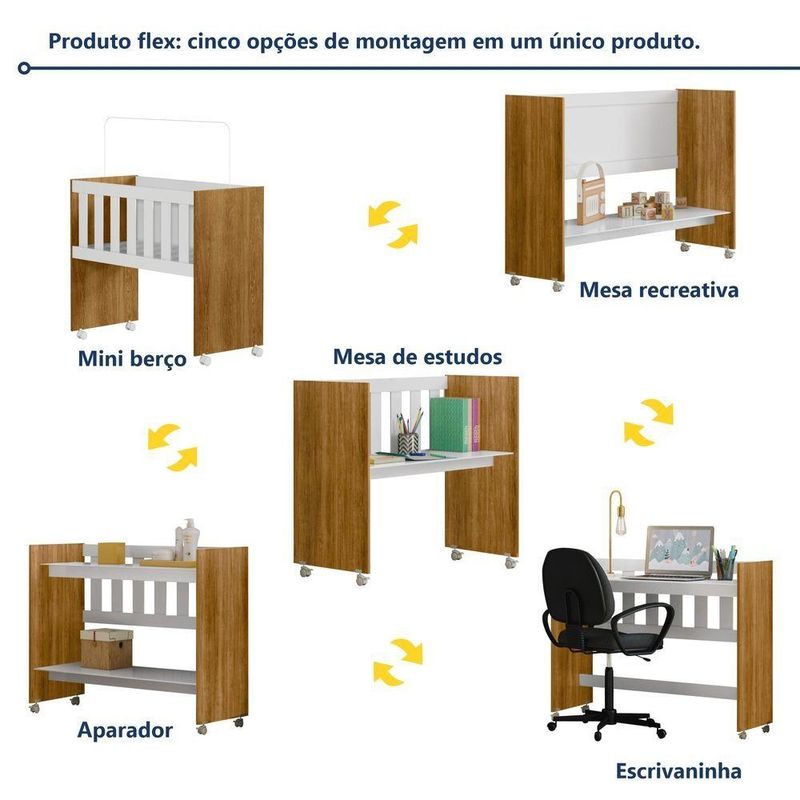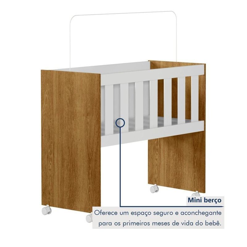 Mini Berço Com Colchão E Suporte Mosquiteiro 5 Em 1 Rubi 100% Mdf Branco/madeirado YpêMini Berço 100% MDF com Colchão 5 em 1 Rubi – Lojas CuritibanasVersatilidade, Segurança e Conforto em um Único MóvelO Mini Berço Rubi 5 em 1 das Lojas Curitibanas é a solução inteligente e funcional para o primeiro quarto do bebê. Fabricado em 100% MDF, ele une alta durabilidade com um design moderno e compacto, ideal para manter o recém-nascido sempre por perto nos primeiros meses.Seu grande diferencial é o conceito Multifunção Flex, que permite a transformação do móvel em 5 fases diferentes, acompanhando o crescimento da criança e as necessidades da casa: Miniberço, Mesa de Recreação, Mesa de Estudos, Aparador e Escrivaninha. Além disso, o conjunto já acompanha o colchão adequado e suporte para mosquiteiro, garantindo o melhor custo-benefício.Principais Benefícios (Diferenciais):Móvel 5 em 1: Versatilidade total, transformando-se de miniberço para mesa de estudos ou aparador.100% MDF: Estrutura robusta com acabamento em pintura UV acetinada de alta qualidade.Mobilidade e Segurança: Possui rodízios com trava, facilitando o deslocamento entre os cômodos com total estabilidade.Saúde e Proteção: Pintura atóxica segura para o bebê e acompanha suporte para mosquiteiro (sem véu).Conjunto Completo: Já inclui colchão com densidade D-18, proporcionando o suporte ideal para um sono tranquilo.Ficha Técnica DetalhadaProduto: Mini Berço MultifuncionalModelo: Rubi (5 em 1)Marca: Tigus BabyAltura: 80 cmLargura: 94 cmProfundidade: 43 cmPeso Suportado: Até 30 kgMaterial Principal: 100% MDFAcabamento: Pintura UV Atóxica (Acetinado)Transformação: Miniberço, Mesa de Recreação, Mesa de Estudos, Aparador e EscrivaninhaRodízios: Sim, com trava de segurançaAcompanha Colchão: Sim (Densidade D-18)Suporte Mosquiteiro: Sim (Incluso)Garantia: 90 dias contra defeitos de fabricaçãoRecomendações de Uso, Manutenção e LimpezaPara conservar a qualidade do móvel, realize a limpeza com um pano macio e levemente umedecido. Não utilize produtos abrasivos ou solventes inflamáveis para não danificar o acabamento e a segurança da pintura atóxica.Montagem e EntregaNão oferecemos serviço de montagem.O produto é entregue desmontado e acompanha manual de instruções com sistema de parafusos e buchas americanas.A complexidade da montagem é média; recomendamos a contratação de um profissional qualificado para garantir a correta montagem em todas as fases de uso.ImagensImagens ambientadas são meramente ilustrativas.Objetos decorativos e véu do mosquiteiro não acompanham o produto.As cores podem sofrer variação conforme a iluminação, monitor ou percepção visual.