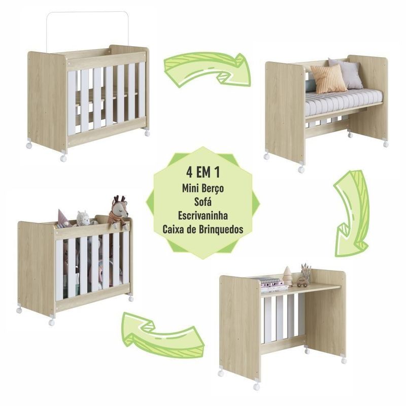 Mini Berço Infantil Moisés Multifuncional 4 Em 1 Com Rodas Para Quarto De Bebê Carvalho AraguaiaO Mini Berço Infantil Moisés Multifuncional 4 em 1 com Rodas para Quarto de Bebê da Completa Móveis a escolha perfeita para acompanhar o crescimento do seu bebê com e versatilidade. Certificado para garantir a máxima proteção, ele se transforma facilmente em mini berço, um confortável sofazinho, uma escrivaninha para estudos e até uma caixa para brinquedos, livros ou outros acessórios, adaptando-se a diferentes fases da infância.Produto 100% MDP.DIMENSÕES DO MINI BERÇO MONTADO:Largura: 90,6cmAltura: 74cmProfundidade: 45cmPeso suportado: 15KgCORES:BrancoCarvalho Araguaia com BrancoPRODUTO ENTREGUE DESMONTADO.MONTAGEM NÃO INCLUSA.NÃO ACOMPANHA COLCHÃO.COLCHÃO INDICADO (LXPXA): 86X38X10CM.Produto composto por 1 volume.Acompanha manual de montagem.Peso total do produto: 19,70Kg.Espaço entre as grades: 6cm.Quantidade de regulagem do estrado: 01Altura do estrado até o chão: 37cmPossui 02 rodízios com trava e 02 rodízios sem trava.Com grade fixa.Acompanha suporte para mosquiteiro sem véu. do Registro do Inmetro: 010023/2025Idade recomendada: 0 à 6 meses.DICAS DE MONTAGEMForre o chão com o próprio papelão.Separe as peças e acessórios de acordo com o manual.Confira se todas as peças foram recebidas corretamente.Use um pano levemente umedecido com água, seguido de pano seco. Não utilize produtos químicos ou abrasivos. Marca: Completa Móveis | Modelo: Mini Berço 4 em 1 | Material: MDP | Acabamento: Fosco | Largura (cm): 90,6 | Altura (cm): 74 | Profundidade (cm): 45 | Peso do Produto (Kg): 19,7 | Quantidade de Volume: 1 | Peso Suportado (Kg): 15 | do Certificado Registro do Inmetro: 010023/2025 | Tipo de Grade: Fixa | Material da Grade: MDP | Espaço entre Barras da Grade (cm.): 6 | Material do Estrado: MDP | Quantidade de Regulagem do Estrado: 1 | Opções de Altura do Estrado (cm): 37 | Acompanha Suporte de Mosquiteiro: Sim, sem véu | Colchão Indicado (LxPxA) (cm): 86x38x10 | Acompanha Colchão: Não | Possui Rodízios: Sim, 2 com trava e 2 sem trava | Necessita Montagem: Sim | Nível de Dificuldade da Montagem: Baixo | Sistema de Montagem: Sistema de montagem via parafusos, cavilhas e sistema minifix | Idade Recomendada (meses): 0 à 6 | Idade Mínima Recomendada (meses): 0 | Idade Máxima Recomendada (meses): 6 | Quantidade de Item: 1 | Duração da Garantia: 6 Meses | País de Origem: | Tipo de Garantia: Garantia do Fabricante | Dimensão (AxLxC) cm: 74x45x90,6 | Baterias Necessárias: Não | Componentes Incluídos: Instrução de Montagem | da Peça: BB040 | Tamanho: Berço | Principal Característica do Produto 01: Mini Berço Infantil 4 em 1 | Principal Característica do Produto 02: Mini Berço Infantil Moisés Multifuncional | Principal Característica do Produto 03: Mini Berço Infantil com Rodas e Grade Fixa | Inclui Manual de Montagem: Sim | Possui Gaveta: Não | Cor: Carvalho Araguaia