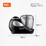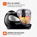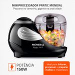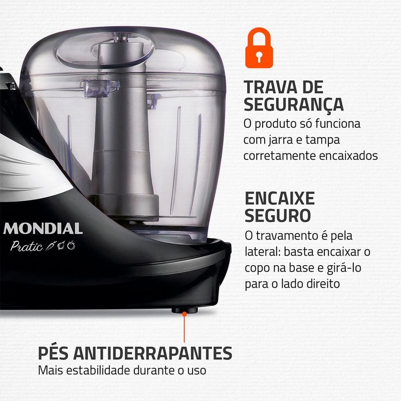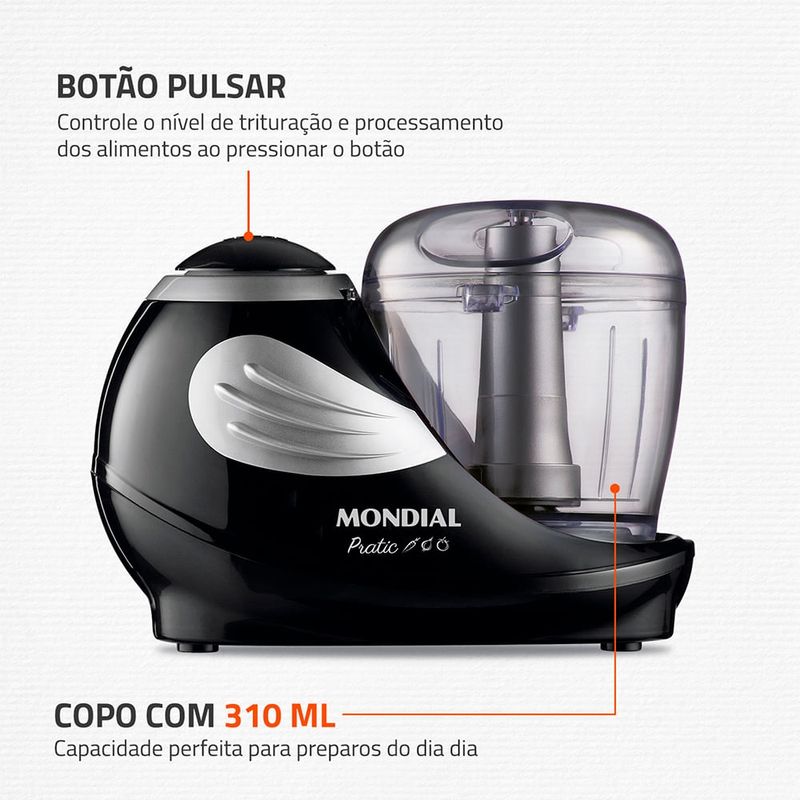 O miniprocessador Pratic Mondial tem 150W de potência função Pulsar para controlar a trituração e preparar molhos maioneses carnes temperos chocolates e queijos com praticidade. As lâminas em aço inox oferecem mais eficiência e durabilidade e o copo de 310ml em plástico livre de BPA é indicado para pequenas quantidades. Conta com trava de segurança pés antiderrapantes peças removíveis para facilitar a limpeza e 1 ano de garantia Mondial. Saiba mais sobre o MP-05-B da Mondial: POTÊNCIA DE 150W: Ideal para triturar legumes processar carnes moer temperos e fazer molhos e maioneses. PULSAR: Ao pressionar o botão você controla o grau de trituração e movimenta melhor os ingredientes no copo. VERSATILIDADE DE RECEITAS: Você pode: fazer molhos maioneses processar carnes moer temperos triturar chocolates queijos e muito mais. LÂMINAS EM AÇO INOX: Mais eficiência e durabilidade. COPO DE 310ML: Capacidade para pequenas quantidades feito em plástico livre de BPA mais segurança no preparo dos alimentos. TRAVA DE SEGURANÇA O produto só funciona com jarra e tampa corretamente encaixados. O travamento é pela lateral: basta encaixar o copo na base e girá-lo para o lado direito. PÉS ANTIDERRAPANTES Mais estabilidade durante o uso. PEÇAS REMOVÍVEIS Na hora de lavar basta desmontar mais facilidade no encaixe e na limpeza. UM ANO DE GARANTIA MONDIAL A Mondial é a escolha de milhões de consumidores. Mondial a escolha inteligente!