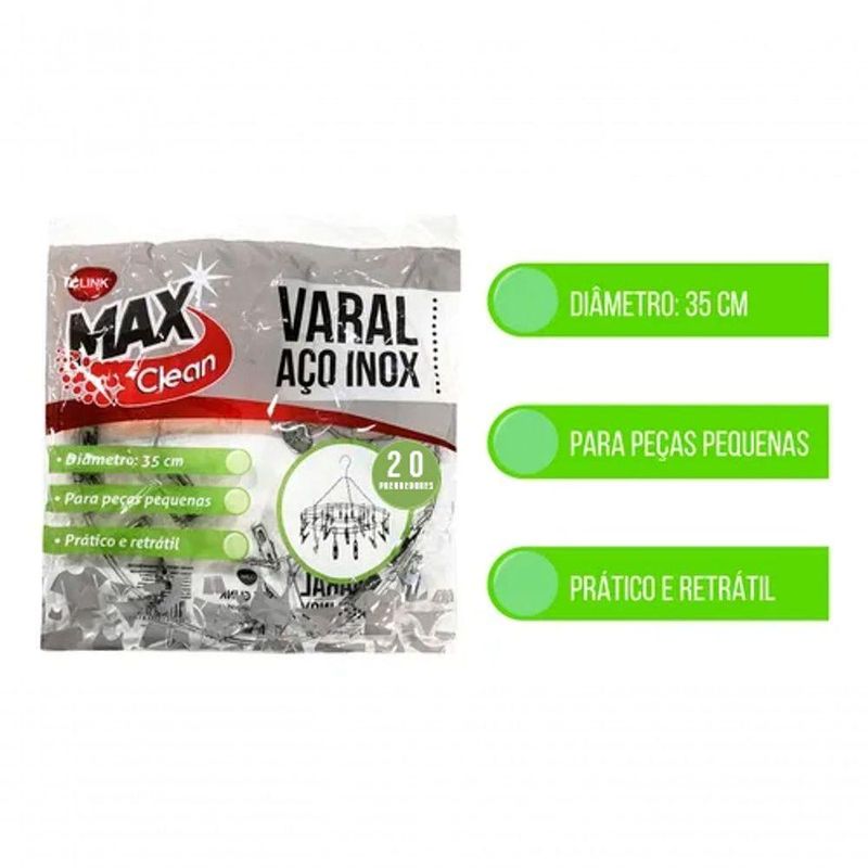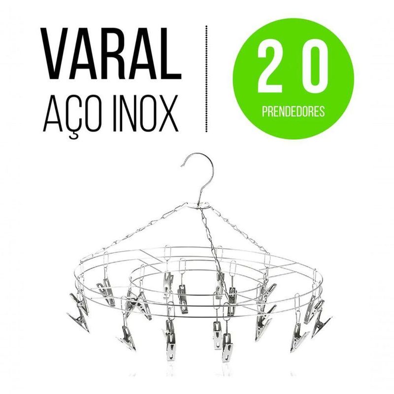 Mini Varal Aço Inox Multiuso 20 Prendedores Redondo TetoDescrição do ProdutoO Mini Varal Redondo em Aço Inox com 20 prendedores é a solução prática e resistente para secar peças pequenas de forma organizada. Compacto e fácil de pendurar, é ideal para ambientes internos e externos, trazendo mais praticidade ao seu dia a dia.Benefícios do Mini Varal- Estrutura em aço inox resistente e durável- Não enferruja mesmo em áreas úmidas- 20 prendedores com trava anti-ventania- Ideal para peças pequenas: meias, roupas íntimas, máscaras e roupas infantis- Design compacto, leve e fácil de transportarCaracterísticas Técnicas- Material: Aço inoxidável- Formato: Redondo- Diâmetro: 35 cm- Quantidade de prendedores: 20 unidades- Resistência à ferrugem e ao desgaste- Sistema de prendedores com trava para maior segurançaIndicações de Uso- Ideal para apartamentos e lavanderias com pouco espaço- Pode ser pendurado em varais, ganchos e suportes- Organiza a secagem sem embaraçar as roupas- Perfeito para uso diário em ambientes internos e externosConteúdo da Embalagem- 01 Mini Varal Redondo de Aço Inox com 20 prendedores