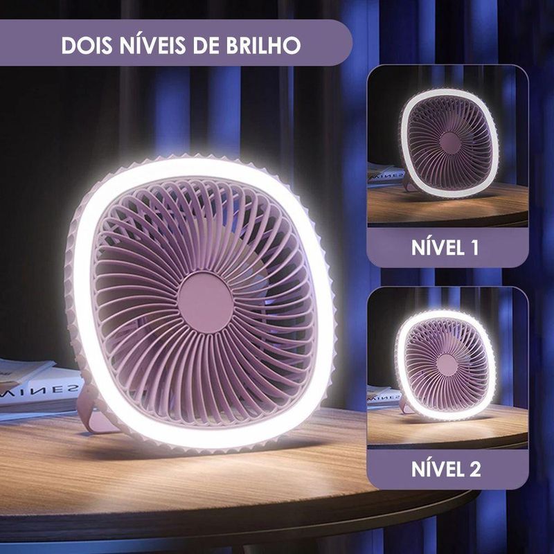Mini Ventilador De Mesa Luz Ring Light Usb Portátil Potente Silencioso Cor:lilásRefresque-se e ilumine o ambiente com estilo! Seja no trabalho, em casa ou em qualquer lugar, o Mini Ventilador te acompanha com praticidade e estilo.Funcionamento silencioso, ideal para ambientes de trabalho e estudo, com 3 velocidades ajustáveis para personalizar o fluxo de ar ideal. Seu tamanho compacto e portátil, perfeito para levar com você aonde for.A Luz Ringlight integrada conta com 2 níveis de brilho para iluminar suas selfies e manter videochamadas perfeitas. Possui bateria recarregável e um design moderno e elegante que complementa qualquer ambiente.Versátil e multifuncional: Use-o na mesa, no notebook, na cabeceira da cama ou pendurado na parede.Especificações Técnicas:- Modelo:Mini Ventilador Ringlight- Material: Plástico Resistente, Componentes Elétricos.- Alimentação de Energia: Via Cabo USB Tipo C (BIVOLT)- Potência: 5W- Capacidade de Bateria: 500mAh- Dimensões Aprox.: 20cm (Largura) X 20xm (Comprimento) X 8,5cm (Profundidade)Itens inclusos na Embalagem:- 01xMini Ventilador Ringlight- 01x Cabo USB