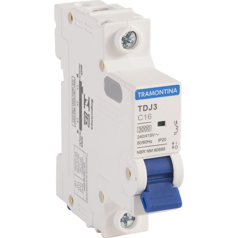 Minidisjuntor TDJ3kA 1 P 16 A curva C Tramontina Leve alta qualidade para seus projetos elétricos, com o minidisjuntor TDJ3kA 1 P 16 A curva C Tramontina. Desenvolvido para garantir a segurança da instalação ele preserva a rede elétrica e seus equipamentos em caso de sobrecarga ou curto-circuito. Ele possui janela de inspeção do estado, é instalado no quadro de distribuição e dimensionado de acordo com a potência dos equipamentos, números de tomadas e quantidade de lâmpadas. Sua montagem é individual, sem a necessidade de desmontar o barramento, o que otimiza o tempo de instalação. Um item com a qualidade Tramontina, que você já conhece e confia! Este produto não é indicado para instalações fotovoltaicas. Para esta aplicação, favor consultar os disjuntores das linhas TDJ6 e TDJ10.