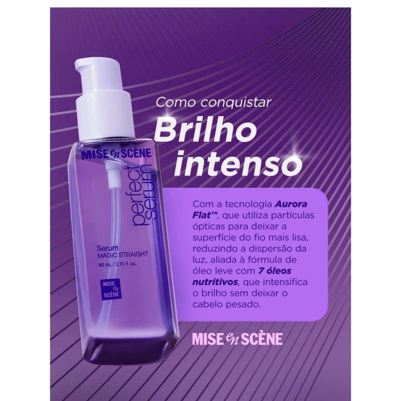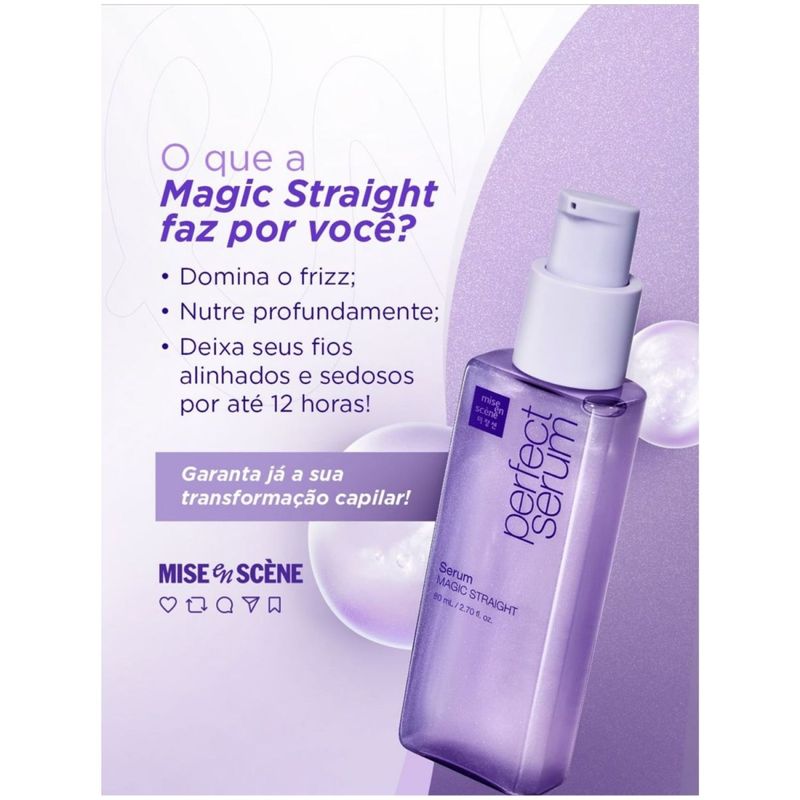 O Mise En Scene Perfect Serum Magic Straight – Sérum Capilar 80ml foi desenvolvido para quem deseja cabelos mais lisos, alinhados e sem frizz, com acabamento suave e natural. Sua fórmula ajuda a disciplinar os fios, controlar o volume e facilitar a finalização, deixando o cabelo com aspecto sedoso e bem cuidado. Com textura leve e rápida absorção, o sérum não pesa e pode ser usado em cabelos úmidos ou secos, sendo ideal para o uso diário. Além de auxiliar no alinhamento, proporciona brilho intenso e maciez, mantendo os fios organizados por mais tempo. Perfeito para quem busca praticidade e efeito liso elegante no dia a dia, o Magic Straight é um aliado indispensável na rotina capilar. Destaques do produto: Efeito liso e alinhado Controle de frizz e volume Textura leve e não oleosa Proporciona brilho e maciez Facilita a finalização Uso diário Conteúdo: 80ml