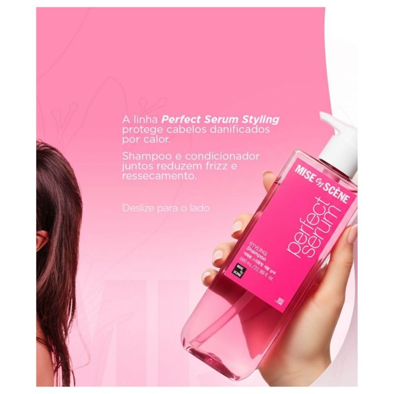 O Mise En Scene Perfect Serum Styling Shampoo foi desenvolvido para promover limpeza eficaz, nutrição equilibrada e cabelos visivelmente mais saudáveis. Enriquecido com os ativos da consagrada linha Perfect Serum, ele ajuda a restaurar a maciez, o brilho e o alinhamento dos fios desde a primeira lavagem. Sua fórmula limpa suavemente sem ressecar, auxiliando no controle do frizz, na melhora da textura capilar e na preparação dos fios para a finalização. Ideal para uso diário, o shampoo proporciona um toque leve, sedoso e acabamento profissional. Principais Benefícios: Limpeza eficaz e suave Nutrição e hidratação equilibradas Auxilia no controle do frizz Proporciona maciez e brilho Melhora a textura e o alinhamento dos fios Indicado para todos os tipos de cabelo Modo de Uso: Aplique o shampoo nos cabelos molhados, massageando suavemente o couro cabeludo até formar espuma. Enxágue bem. Se necessário, repita a aplicação. Resultado: Cabelos limpos, macios, alinhados e com brilho natural, prontos para receber o condicionador e os tratamentos da linha Perfect Serum Styling.