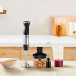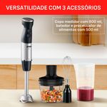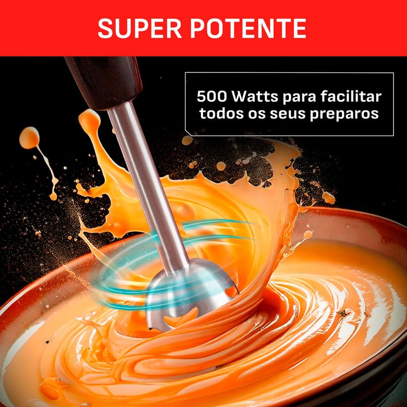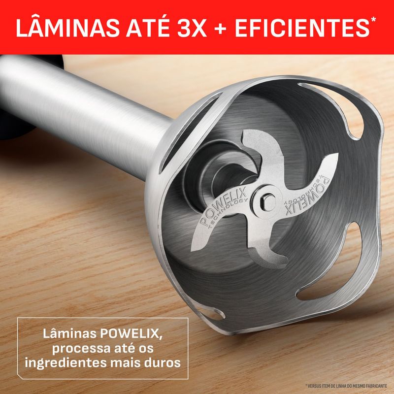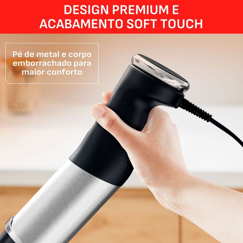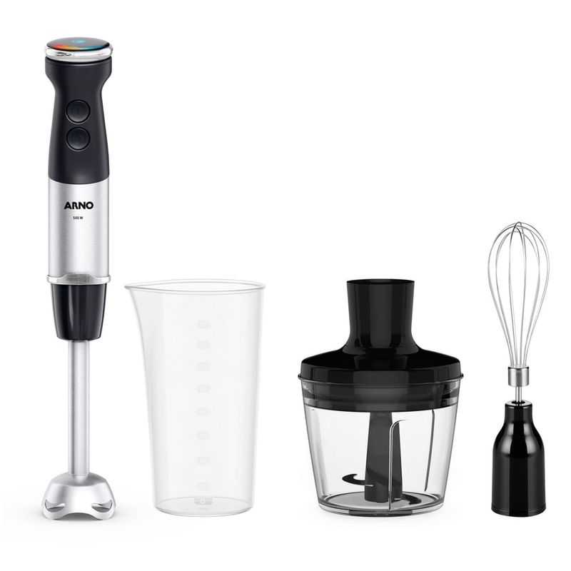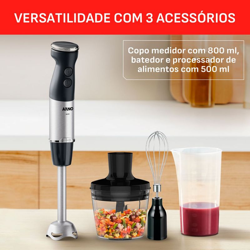 Arno Quick chef +, com tecnologia Powelix é a escolha perfeita para quem busca desempenho, praticidade e silêncio na cozinha. Com motor de 500w, ele garante até 3 vezes mais eficiência* no preparo de receitas, triturando até os ingredientes mais duros com facilidade. A tecnologia Powelix oferece alto poder de corte, com lâminas ultra afiadas que entregam resultados rápidos e homogêneos em qualquer tipo de preparo. Com painel digital com 20 velocidades, você tem o controle total, adaptando o uso conforme a textura desejada. O modo silencioso permite preparar suas receitas com conforto, ideal para uso diário sem incômodos. Acompanha 3 acessórios essenciais: copo medidor de 800ml, processador de alimentos de 500ml e batedor de claras, perfeitos para preparar desde smoothies, até chantillys e massas leves. Além de potente, o mixer feito em aço inoxidável é prático: pode ser usado diretamente na panela, seu pé é removível, facilitando a limpeza, e o design com protetor anti-respingos evita sujeiras indesejadas. Compacto, ergonômico e fácil de guardar, o Quick Chef+ é seu aliado para preparar molhos, sopas, sucos, purês e muito mais, com agilidade, eficiência e a qualidade que só a Arno oferece. *Vs item de linha do mesmo fabricante CaracterísticasTipo: Mixer Painel Digital: 20 VelocidadesCapacidade: 0,8 LitrosBatedor de Massas/ClarasHaste DestacávelLâminas: Tecnologia PowelixModo SilenciosoDesign PremiumAcabamento Soft Touch Especificações TécnicasModelo: MX41Potência: 500WConsumo de Energia: 0,5 kW/hCor: Inox e PretoVoltagem: 110V / 220V (Não é Bivolt)EAN: 3016667299012 (110V) / 3016667299005 (220V)Garantia: 12 meses Dimensões e PesoDimensões do produto sem embalagem (AxLxP): 415x70x70 mmDimensões do produto com embalagem (AxLxP): 258x144x254 mmPeso do produto sem embalagem: 1,16 KgPeso do produto com embalagem: 1,16 Kg Itens Inclusos01 MixerAcessóriosManual