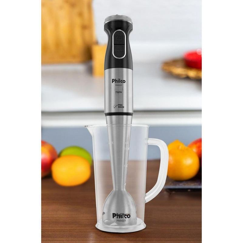 Mixer Philco Inox Com Copo 1050ml 750W PMXE01 220VO Mixer Philco Inox com Copo 1050ml 750W PMXE01 proporciona desempenho incrível ao triturar e processar alimentos. Seu corpo desmontável facilita a limpeza e o armazenamento, enquanto as lâminas em aço inox asseguram maior eficiência na trituração. Com uma potência de 750W é possível preparar receitas e usar diferentes ingredientes de forma rápida e prática. O copo de 1050ml do Mixer, equipado com alça e tampa, simplifica o armazenamento na geladeira e permite a preparação da quantidade ideal para suas receitas favoritas. O cabo elétrico de 1,4 metros proporciona liberdade durante o manuseio do produto enquanto o design ergonômico exclusivo segue os contornos da mão, garantindo um uso confortável e seguro.O Mixer Philco PMXE01 oferece uma solução prática e versátil para o preparo rápido e eficaz de alimentos. Com sua combinação de potência, design inteligente e demais funcionalidades, é uma escolha ideal para quem busca eficiência na cozinha.Principais Características- Potência de 750W- Velocidade Variável + Turbo- Possui copo com alça e tampa- Capacidade do copo de 1050ml e útil de 800ml- Produto Desmontável- Possui design ergonômico- Possui 1 faca com 4 lâminas (02 grandes e 02 pequenas)- Cabo elétrico com 1,4 m.Observação: Somente faturamos para o nosso consumidor final, ou seja, não faturamos pedidos para CNPJ por este portal de vendas.Especificações TécnicasMarca: PhilcoModelo: PMXE01Cor: PretoEstado: NovoPotência: 750 WVelocidades: 2Corpo desmontável: SimMaterial das lâminas: InoxAltura do produto: 39,5 cmLargura do produto: 6,5 cmComprimento do produto: 6,5 cmPeso do produto: 1,105 kgAltura com embalagem: 23,5 cmLargura com embalagem: 16,6 cmComprimento com embalagem: 12 cmPeso com embalagem: 1,284 kgGarantia: 360 Dias