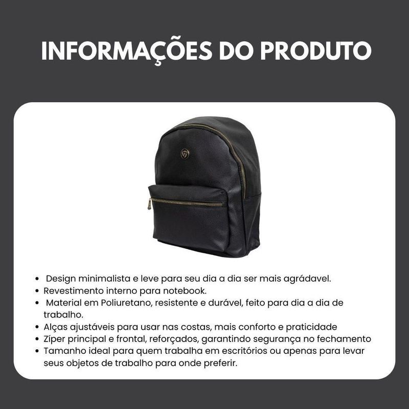 Mochila Feminina Preta Média Executiva Casual Social Resistente Em Poliuretano - Majestic - Yins Brasil - Preto PretoDescubra a Mochila Feminina Preta Média Majestic, a escolha ideal para mulheres que buscam praticidade e estilo no dia a dia. Confeccionada em poliuretano resistente, combina durabilidade com um design sofisticado, perfeito para ambientes executivos e ocasiões sociais casuais. Seu tamanho médio é ideal para acomodar notebook, documentos e itens pessoais com organização e conforto.Principais atributos:- Material resistente em poliuretano, fácil de limpar e impermeável- Compartimento principal espaçoso para notebooks até 15- Bolso frontal com zíper para acesso rápido a objetos essenciais- Alças ajustáveis acolchoadas que proporcionam conforto mesmo em uso prolongado- Design elegante e discreto, ideal para uso profissional e casualGaranta uma mochila que une funcionalidade e elegância para profissionais modernas que valorizam qualidade e estilo. A Majestic é referência em resistência e sofisticação para o seu dia a dia.Ficha Técnica: Material: Poliuretano Marca: Yins Brasil Garantia: 03 meses Altura: 38 cm Largura: 28 cm Profundidade: 11 cm Capacidade em volume: 11 litros Peso líquido: 700g Rodinhas: Não Compartimentos: 2 compartimentos Bolsos laterais para garrafinhas e sombrinhas: NãoInformações da Mochila: 1 Bolso Principal e 1 Frontal; Mochila de Costas com Alça Resistente; Impermeável; Estampa Lisa em Poliuretano; Zíper interno para colocar objetos da sua preferência; Bolsinhos internos; Espaço para Notebook de até 14 Dúvidas FrequentesQual o prazo de postagem?Nosso prazo de postagem é de no máximo 1 dia útil, podendo ser até no mesmo dia da confirmação da compra, dependendo do horário.Como o produto vem embalado?Nossos produtos são embalados com embalagens resistentes para que cheguem até você em perfeito estado.O produto possui garantia?Sim, todos os nossos produtos são originais e possuem garantia de fabricação de no mínimo 90 dias, conforme previsto no código de defesa do consumidor.