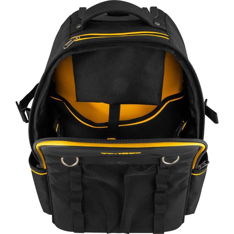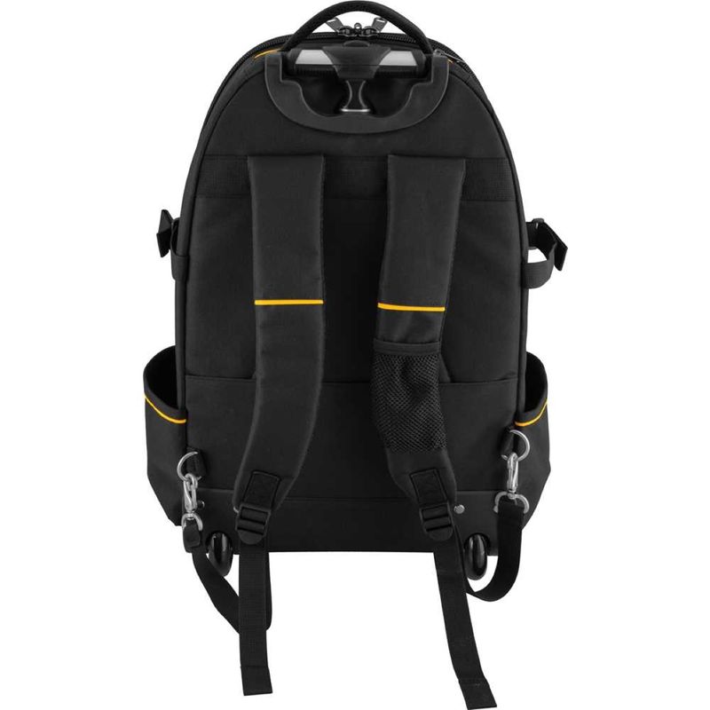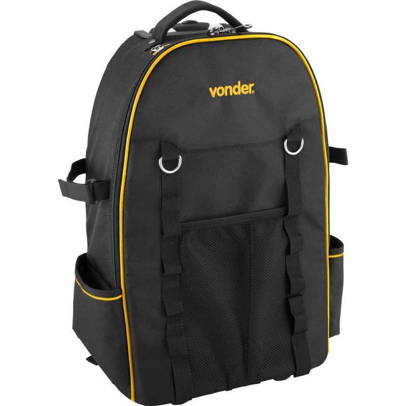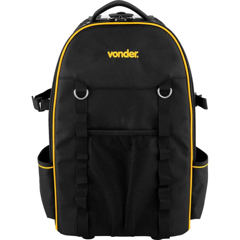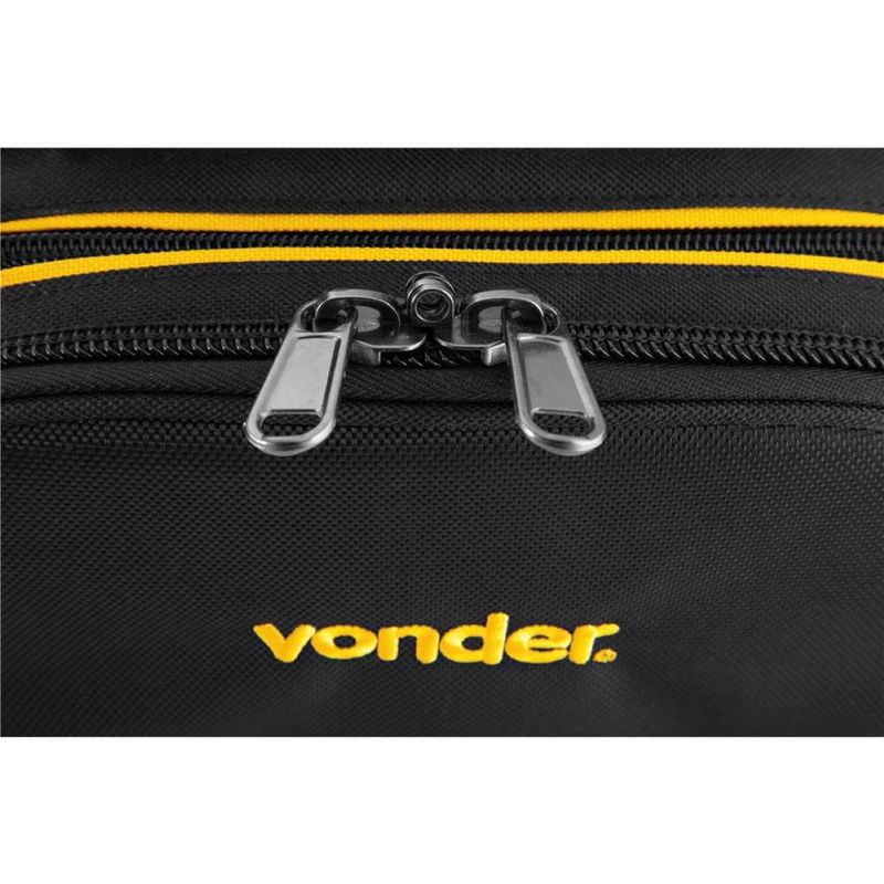 Código do Fornecedor: 3540580000Marca: Vonder Conteúdo da embalagem: 1 Mochila Para Ferramentas MOV0580 VonderDestaques e diferenciais: Confeccionada em lona reforçada, possui alças de costas acolchoadas com regulagem, 2 alças auxiliares e zíper reforçado com encaixe para cadeado, conferindo ótima resistência e segurança dos itens acondicionados no interior da mochila. Possui ainda 2 rodas, puxador extensível em alumínio, 2 divisões/bolsos na parte interna e 7 divisões/bolsos na parte externa, proporcionando facilidade no transporte e praticidade na organização.Aplicações e dicas de uso: Indicada para uso geral.Garantia legal: 90 diasDetalhes TécnicosModelo: MOV 0580 Material da mochila: Lona reforçada Capacidade de carga (kgf): 20 kgf Dimensões (L x A x P) (mm): 370 mm x 550 mm x 220 mm Cor da mochila: Preta com amarelo Massa aproximada (peso) (kg): 2,60 kg