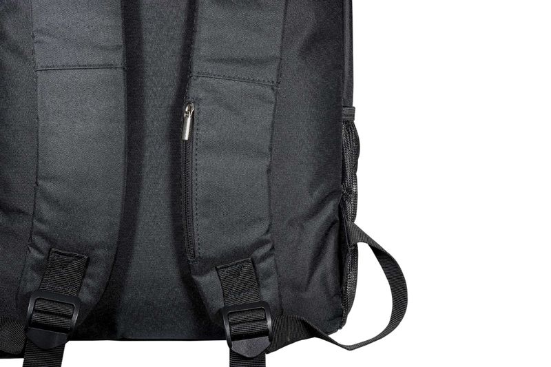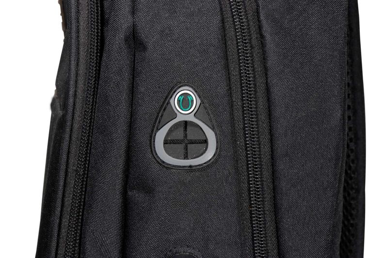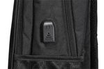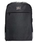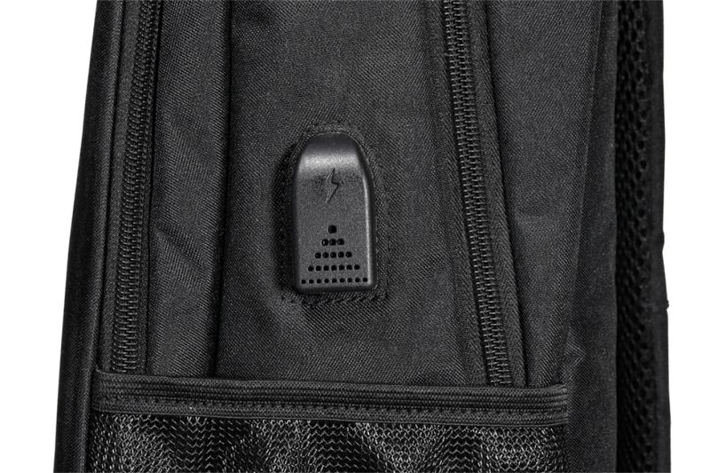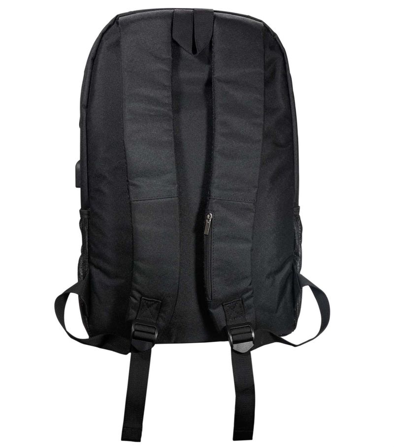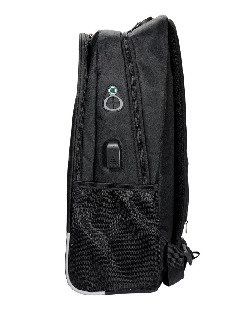 Compartimento principal com bolso interno para notebook e Cadeado por senha no bolso principal e Amplo bolso frontal e Dois bolsos laterais em rede e Alça com bolso para dinheiro e cartão e Entrada para USB e Alça de mão e A mochila não carrega celular, possui apenas o conector para esse fim e Compartimento para Notebook de até 15.6 e Detalhes refletivos para aumentar a sua segurança durante a noite e Fechamento em zíper e Costura de ótima qualidade com fino acabamento e Design exclusivo antifurto e Produzida em poliéster e Dimensões: 42 x 30 x 13cm e Peso: 500gr