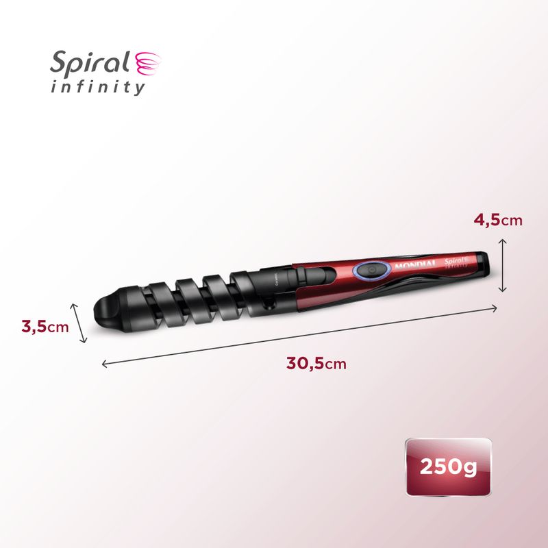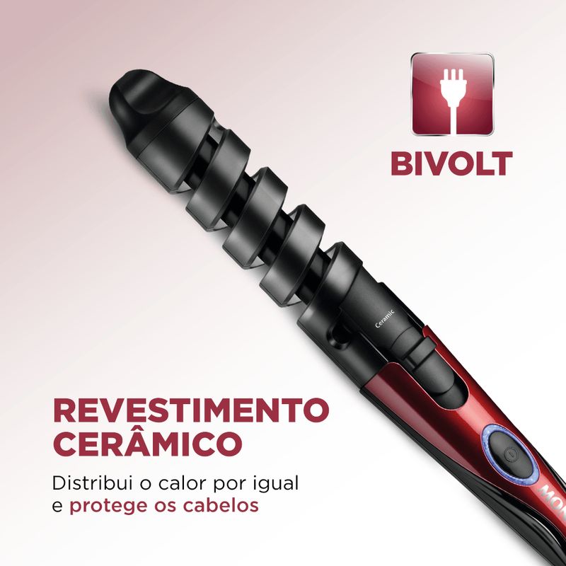Cachos lindos, naturais e bem modelados. Este é o resultado que a Escova Modeladora Spital Infinity te proporciona! O formato espiral é fácil de manusear, direciona as mechas e deixa o cabelo super definido. O modelador de cachos Mondial ainda possui revestimento cerâmico, o que protege e dá brilho aos fios. Saiba mais sobre EM-05: REVESTIMENTO CERÂMICO: A escova modeladora tem revestimento em cerâmica e, por isso, distribui o calor por igual, dá brilho e protege os cabelos. FÁCIL DE USAR: DIRECIONADOR DE MECHAS: O formato espiral é superfácil de manusear e cria cachos bem definidos, com total praticidade e rapidez. PRESILHA: Ajuda a prender a ponta da mecha e facilita na hora de modelar o cabelo. BIVOLT: A escova modeladora é compatível com tomadas 127 e 220V. Leve-a para qualquer lugar! TEMPERATURA: A temperatura é constante de 180°C, ideal para modelar o cabelo com facilidade e rapidez. CABO GIRATÓRIO 360°: Mais fácil de manusear: o fio da escova modeladora é giratório e não enrola durante o uso.