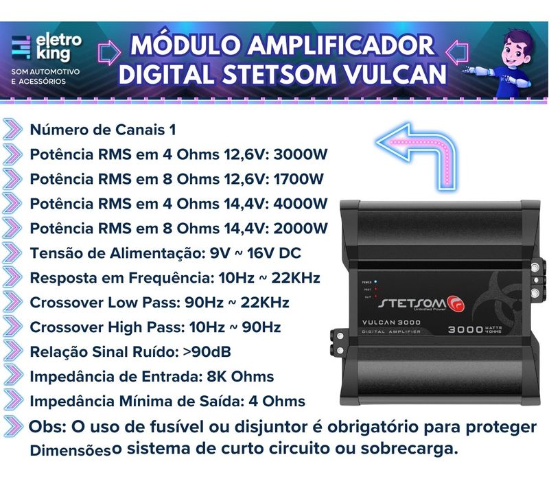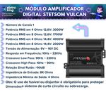 Módulo Amplificador Digital Stetsom Vulcan 3000 Watts Rms 1 Canal - 4 Ohms É um amplificador de alta potência projetado para entusiastas do som automotivo que buscam desempenho máximo. Este amplificador de canal único (mono) oferece uma potência de saída de 3000 watts RMS a 4 ohms, tornando-o ideal para subwoofers, woofers, drivers e tweeters. É um amplificador de classe D, que proporciona eficiência energética e menor dissipação de calor. Especificações Técnicas: • CARACTERÍSTICAS VULCAN 3000 – 4 OHMS • Número de Canais 1 • Potência RMS em 4 Ohms 12,6V: 3000W RMS • Potência RMS em 8 Ohms 12,6V: 1700W RMS • Potência RMS em 4 Ohms 14,4V: 4000W RMS • Potência RMS em 8 Ohms 14,4V: 2000W RMS • Tensão de Alimentação: 9V ~ 16V DC • Resposta em Frequência: 10Hz ~ 22KHz • Crossover Low Pass: 90Hz ~ 22KHz • Crossover High Pass: 10Hz ~ 90Hz • Relação Sinal Ruído: >90dB • Sensibilidade de Entrada: 200mV • Impedância de Entrada: 8K Ohms • Impedância Mínima de Saída: 4 Ohms • Consumo com Sinal Musical: 137A • Consumo com Sinal Bass: 273A • Dimensões (A x L x C) mm: 78 x 231.5 x 239.5 mm • Peso Kg: 2.8 Kg Conteúdo da Embalagem: • 01 Módulo Amplificador Digital Stetsom Vulcan • Manual e Certificado de Garantia. Importante: • Garantia de 273 Dias. • Valor Unitário.