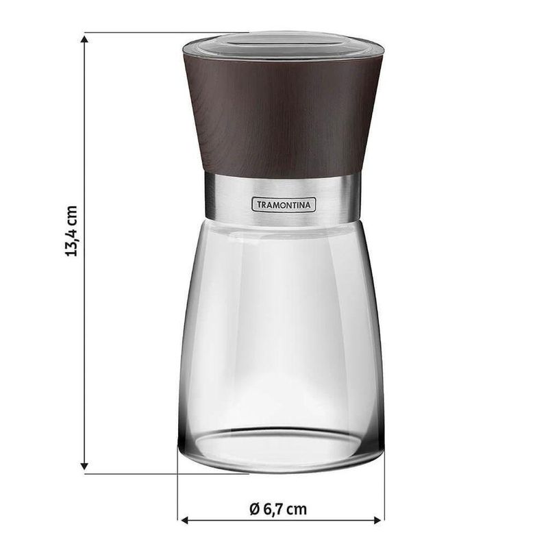 Moedor De Pimenta E Sal Tramontina UtilitáPrático para temperar os alimentos na medida certa, o Moedor de Pimenta e Sal Utilitá em Cerâmica e Vidro Tramontina é a escolha ideal. Ele conta com moedores em cerâmica ajustáveis para o tamanho do grão e permite a moagem do grão conforme seu gosto e necessidade. Suas engrenagens são resistentes, o recipiente é de vidro com tampa de plástico e ele tem capacidade para 200 gramas de sal ou 100 gramas de pimenta.Recomendações de Uso:Antes do Uso: Lave bem a peça e seque-a.Modo de Uso: Tenha cuidado ao manusear o recipiente. Por ser de vidro, poderá quebrar ao sofrer quedas ou impactos. Para maior durabilidade do produto recomenda-se lavar manualmente com detergente ou sabão neutros. Seque bem antes de guardar ou antes de repor o tempero. Para descarte do produto e embalagem siga as orientações de reciclagem vigentes. Para abastecer: desenrosque o recipiente de vidro, segurando o anel de aço inox. Adicione o sal grosso ou a pimenta. Enrosque novamente o recipiente de vidro, segurando o anel de aço inox até que esteja firmemente fixado ao anel. Para moer: retire a tampa plástica transparente e posicione o moedor de cabeça para baixo. Com uma das mãos, segure a tampa e com a outra gire o recipiente de vidro no sentido horário para moer o tempero.- Foto meramente ilustrativa.Informações Adicionais:- Recipientes de vidro e tampas de plástico;- Possui engrenagens de alta resistência, proporcionando maior durabilidade;- Moedores de cerâmica com regulador de tamanho do grão, para que seja ajustado conforme seu gosto.