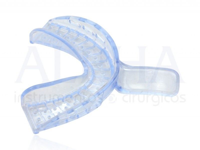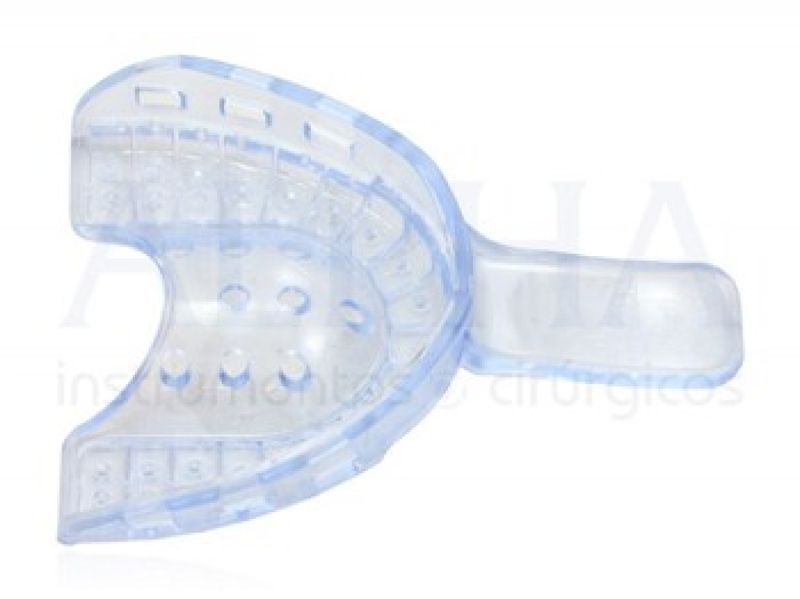 Par de moldeira para implante superior e inferior grande. Fabricada em policarbonato. Modeiras de Implantes com transfers de Moldeira aberta individual ou protocolos. Proporciona moldagem de implantes individuais ou protocolo, sem a necessidade de confeccionar moldeiras individuais; através de um sistema de remoção de janelas, conforme a posição do implante, é possível, na mesma sessão, proceder a moldagem com transfers de moldeira aberta, o que garante maior precisão a técnica; Sua transparência permite melhor visualização dos componentes protéticos. Incrivelmente rígida, confeccionada em Policarbonato Especial, resistente a esterilização por Autoclave. O Palato superior é recuado e profundo para evitar o extravasamento do material demoldagem e consequente ânsia do paciente. Graças a uma Inédita borda tipo meia cana, em sua toda sua extensão, evita-se a entrada de ar, e o vácuo formado mantém o material demoldagem seguramente adaptado a superfície interna da moldeira, evitando quaisquer deslocamentos. Retenções especiais também cooperam no aumento daresistência do molde desde a desmoldagem até o vazamento; Cabo anatômico que permite uma confortável apreensão bi digital e maior segurança ao processo de desmoldagem, sem interferir na visualização ou moldagem de implante anteriores; Marcadores de inserção, de -2 a +2 localizados na cabo da moldeira, assegura a correta inserção do materialde moldagem, na mesma posição da prova inicial, sempre alinhado a algum acidente anatômico facial.