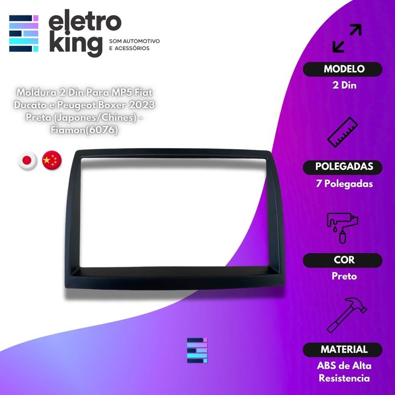 Seja bem-vindo a Eletroking, leia atentamente a descrição do produto abaixo antes da compra, qualquer dúvida, nos acione no campo de perguntas do anúncio. Moldura 2 Din Para MP5 Fiat Ducato e Peugeot Boxer 2023 Preta (Japones/Chines) - Fiamon(6076) Eleve o interior do seu Fiat Ducato e Peugeot Boxer 2023 com a sofisticada moldura da Fiamon. Projetada para se ajustar perfeitamente a padrões Japonês e Chinês, essa moldura não só proporciona a instalação de uma tela de 7", mas também agrega um toque de modernidade e elegância ao seu veículo. Fabricada em ABS de alta resistência, garante durabilidade e acabamento premium na cor preta, combinando estilo e robustez. Atualize o seu carro com a qualidade que ele merece! Especificações Técnicas: • Marca: Fiamon • Padrão: Japonês e Chinês • Modeloo: 2 Din • Tamanho: 7" • Fabricado em ABS de Alta Resistencia • Fácil Aplicação • Encaixe Perfeito • Cor: Preto Conteúdo da Embalagem: • 01 Moldura 7" Fiamon 2 Din - Ducato e Boxer 2023 • Cartão de garantia • Manual Importante: • Garantia de 90 Dias. • Valor Unitário. • Todos os Nossos Produtos São Novos, Originais e Acompanham Nota Fiscal. • A Eletroking recomenda que a instalação seja feita por profissional especializado e não se responsabiliza pelo mau uso do produto.