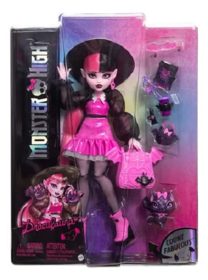 Monster High Core Boneca Draculaura 25 Cm Com Monster Pet e Acessorios - Mattel DRACULAURA DE MONSTER HIGH. A charmosa vampira Draculaura™ usa a roupa mais vampírica, vestida de rosa e preto da cabeça aos pés acompanhada por seu morcego-gato escuro, o Conde Fabuloso, com um laço e colar rosa.LOOKS MONSTRUOSOS. O conjunto New Look inclui roupas modernas para criar roupas fabulosas. Draculaura™ chama a atenção com uma blusa rosa brilhante com mangas pretas transparentes, saia, chapéu combinando, botins rosa e meia-calça preta.INCLUI ACESSÓRIOS ESCUROS. Os acessórios ajudarão a criar todos os tipos de histórias, o conjunto inclui um livro de feitiços, mochila de morcego, lancheira bento, bebida, protetor solar SPF 500, óculos escuros e brilho labial.Essa boneca Monster High é uma vampira encantadora. Draculaura usa seu fantástico estilo vampírico da cabeça aos pés em rosa e preto. Seu mascote, o Fabuloso Conde, está ao seu lado, tão aterrorizante e adorável como sempre. Idade acima de 4 anos Contem 1 boneca e acessórios Tamanho da embalagem 33 x 25x 7 cm Fabricante Mattel
