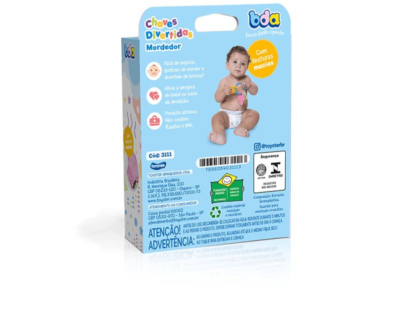 Mordedor - Chaves Divertidas - TOYSTERMordedor Chaves Divertidas da Toyster os Bebês Vão Adorar Esses Mordedores de Chavinhas! Além de Serem Divertidas de Sacudir, Elas Possuem Texturas Gostosas de Morder! com Cheirinho Suave! mordedor Feito em Borracha Termoplástica, 100 Atóxico Não Contém Ftalatos Possui Formato Anatômico, Fácil de SegurarDetalhes: Certificação: Certificado Pelos Órgãos Autorizados - OCP`S(Organismos De Certificação De Produtos) Registro: 000406/2022 OCP 0006Características: Conteúdo da Embalagem: 1 Conjunto de Chave Mordedor Material/Composição: Plástico Código de Barras: 7896054031113 Ref: 3111 Marca: Toyster Modelo: Mordedor Linha: Primeira Infancia Idade Indicada: 12Messes Aviso: As cores podem variar entre as imagens mostradas acima e o produto Imagens meramente ilustrativasGarantia: 3 Meses Contra Defeitos De Fabricação17