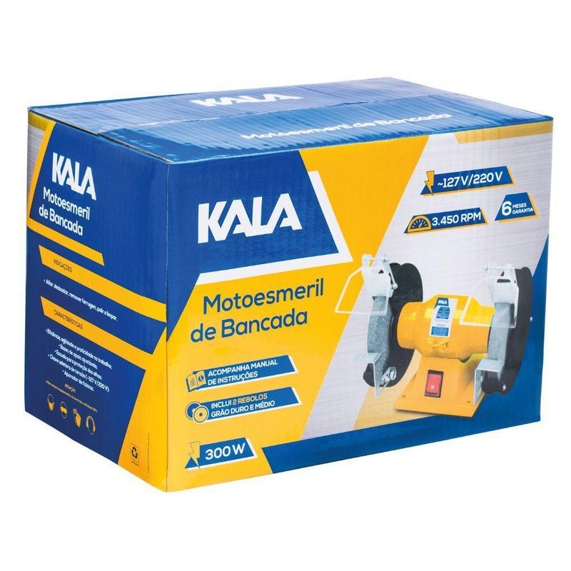 Moto Esmeril 6'' 300w 3450rpm Bivolt KalaMoto Esmeril 6'' Kala: Afiação e Acabamento ProfissionalA Moto Esmeril de Bancada Kala, com 300W de potência e rotação de 3450 RPM, é a ferramenta ideal para quem busca versatilidade e eficiência em trabalhos de afiação, desbaste, remoção de ferrugem, polimento e limpeza. Projetada para lidar com diversos materiais como madeira, metal e plástico, esta moto esmeril oferece uma solução completa para seus projetos. Sua base de apoio ajustável e escudo de proteção garantem segurança e precisão durante o uso, enquanto o interruptor eletromagnético e a chave seletora de tensão proporcionam praticidade e adaptabilidade. Invista em uma ferramenta robusta e ergonômica, que eleva a qualidade do seu trabalho e otimiza seu tempo.Especificações Potência: 300 W Cabo: 1,40m Rotação: 3450 rpm Rebolo: 6 (152mm) Dimensões do Rebolo: 152mm x 16mm x 12,7mm Itens Inclusos 2 rebolos Moto Esmeril 6'' 300W 3450Rpm Bivolt Kala Perguntas Frequentes (FAQ) Pergunta: Qual a voltagem da moto esmeril?Resposta: A moto esmeril é bivolt, possuindo chave seletora de tensão. Pergunta: Quais materiais posso trabalhar com esta moto esmeril?Resposta: Você pode trabalhar com madeira, metal, plástico e outros materiais, dependendo do tipo de rebolo utilizado. Pergunta: A moto esmeril possui proteção para os olhos?Resposta: Sim, a moto esmeril possui escudo para proteção dos olhos. Pergunta: Qual o período de garantia do produto?Resposta: Garantia legal: 90 dias NA
