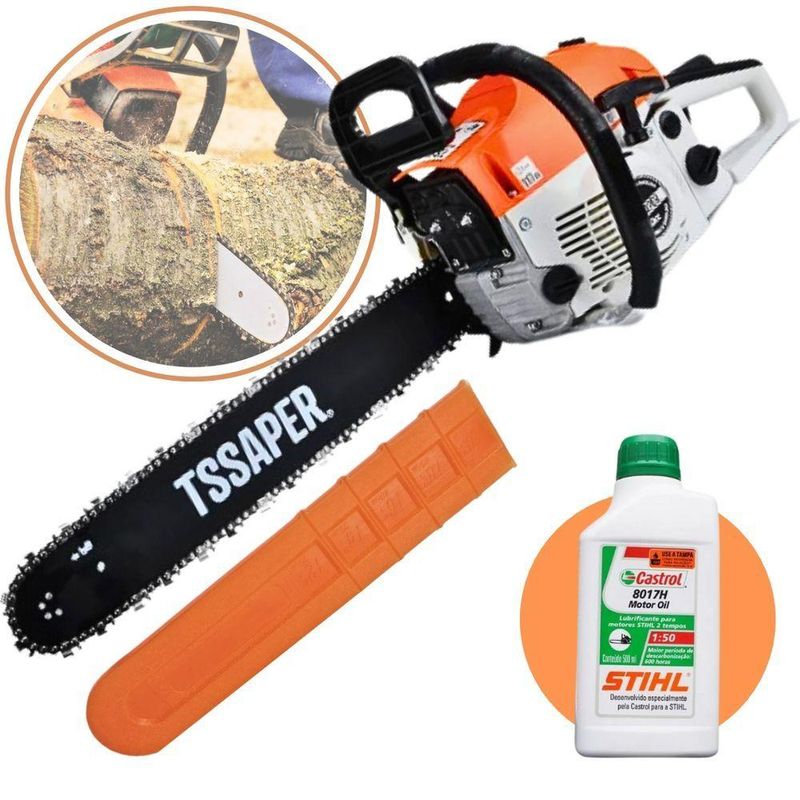 Moto Serra A Gasolina 52cc 3hp Sabre 20 Tsaper Mg52cc + Oleo Stihl 2tMais tecnologia com mais potência! Design ergonômico para usuários profissionais trazendo maior segurança e qualidade no trabalho.Equipamento robusto e potente de fácil manutenção e operação de alta performance, é indicado para uso no setor público, mercado agropecuário, florestal, sítios, ranchos e outros.Sabre de 20'' de comprimento (55,5cm) é perfeito para cortes de árvores em geral. Ideal para podar e cortar árvores ou galhos, além de realizar inúmeros trabalhos de jardinagem.Com alta tecnologia, o motor de 2 tempos possui potência de 52 cilindradas, garantindo a qualidade, eficiência e desempenho do seu trabalho.Especificações:Bomba de lubrificação automática da corrente;Sistema anti vibratório;Freio de corrente;Alto rendimento de corte;Diâmetro máximo de corte: 110 cm (2x55cm);Motor: 2 tempos;Cilindrada: 52 cc;Potência: HP (kw) 2,2kwRotação Máxima: (em vazio) rpm 11000;Rotação em Lenta: rpm 3.200 ± 200;Velocidade Máxima de corte: M/S 23.6;Carburador: Menbrana;Sistema de Ignição: Eletrônico;Sistema de Partida: Manual retrátil;Sistema anti vibratório: Sim;Combustível: Gasolina + Óleo 2TTanque de Combustível: 550 ml;Tanque de Óleo de Corrente: 260 ml;Bomba de Óleo: Automática Regulável;Comprimento do sabre: 20'' (55,5cm)Freio de Corrente: Sim.*Necessário uso de material de segurança para manuseio do equipamento.*Conforme legislação, o proprietário de motosserra deve ter licença para porte e uso conforme IBAMA (lei 7803/89)Itens Inclusos:1 Motor 52 cc;1 Sabre de 20'' / 55,5 cm;1 Corrente de corte;1 Protetor do sabre;1 Kit ferramentas;1 Misturador de combustível;1 Tampa lateral;1 Manual de Instruções.Acompanha no Kit: 1 Oleo Lubrificante Stihl Castrol 2T 500mlGarantia do Fornecedor: 3 meses contra defeito de fabricação.