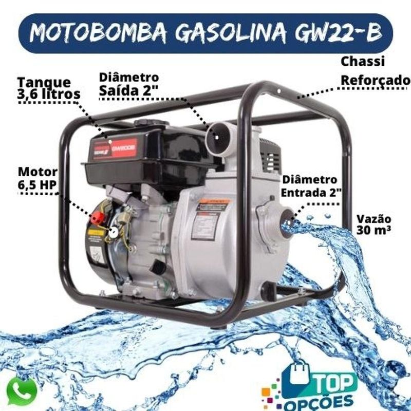 Motobomba 6,5 Hp Gasolina Autoescorvante 2 Pol (196cc) Kawashima Lider de vendas a Motobombas a Gasolina GW 200-B 2 polegadas indicada para Transferência ou elevação de água em diversas situações, com motobombas a gasolina que chega a jogar até 30 m3/h, ótimo custo beneficio, Não é recomendado para bombear produtos químicos, recomendado apenas água sem detritos como areia, lama e lodo.Motobomba Combustão kawashima GW 200 - BTIPO: Motobomba diesel, autoescovante, para água limpaDIÂMETRO DE SUCÇÃO / SAÍDA: 2" ( 50mm) (2X2)Motor: 196 CCPotência: 6,5 HPALTURA TOTAL DE ENVIO: 25 mALTURA TOTAL DE SUCÇÃO: 7 mVAZÃO MÁXIMA: 30 m3/hMOTOR: Kawashima serie ETIPO DO MOTOR: Monocilíndrico, 4T refrigerado a ArSISTEMA DE PARTIDA: Manual, autorretrátilDIMENSÕES: 485x 380 x 405mmPESO LÍQUIDO: 23kgAcompanha: Filtro Sucção, conexões de entrada e saída, abraçadeiraImagem ilustrativa