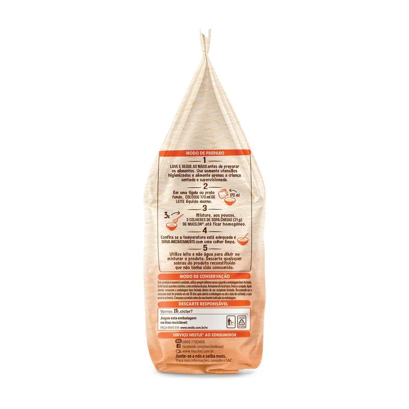 Mucilon Multicereais 600gO Mucilon Multicereais é ideal para suplementação da alimentação de bebês e crianças. Pois o Mucilon Nestlé é rico em vitaminas, minerais e probióticos. Compre na Indiana! Indicação: Indicado para complementar a alimentação de crianças a partir de 6 meses, além de ser uma ótima opção para lanches intermediários. Mucilon Multicereais é um cereal infantil que é rico em nutrientes que contribuem para a Imunidade e Desenvolvimento Cerebral. Nossos grãos são cuidadosamente selecionados de fazendas ao redor do mundo e passam por diversos testes de qualidade. Garantindo Nutrição de qualidade do grão à cumbuquinha. Os cereais Nestlé ricos para uma alimentação mais saudavél e nutritiva. Mucilon é indicado para bebês a partir de 6 meses, pois possui rica fonte de energia e nutrientes que contribuem para o seu crescimento e desenvolvimento. Contém: Vitaminas A, C, D, E, B6, B9 (ácido fólico), ferro e zinco. Ingredientes após o preparo: farinha de trigo enriquecida com ferro e ácido fólico (60%), açúcar, farinha de milho enriquecida com ferro e ácido fólico (14%), farinha de arroz (5,3%), cálcio (carbonato de cálcio), vitamina C (ácido L-ascórbico), ferro (fumarato ferroso), zinco (sulfato de zinco), vitamina E (acetato de DL-α-tocoferila), niacina (nicotinamida), ácido pantotênico (D-pantotenato de cálcio), vitamina B1 (tiamina mononitrato), vitamina A (acetato de retinila), vitamina B6 (cloridrato de piridoxina), ácido fólico (ácido N-pteroil-L-glutâmico), vitamina D (colecalciferol), regulador de acidez fosfato de sódio dibásico e aromatizante vanilina. Modo de Preparo: Lave as mãos antes de preparar os alimentos do seu filho. Use somente utensílios higienizados.Em uma tigela ou prato fundo, coloque 170 ml de leite líquido morno.Misture, aos poucos, 3 colheres de sopa cheias (21g) de Mucilon® Multicereais até ficar homogêneo.Sirva imediatamente com uma colher limpa. ALÉRGICOS: CONTÉM DERIVADOS DE TRIGO. PODE CONTER LEITE, SOJA, CENTEIO, CEVADA E AVEIA. CONTÉM GLÚTEN.