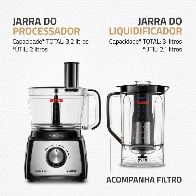 Transforme sua cozinha com o Multiprocessador Mondial Turbo Chef 9 em 1 MPN-01-BF, um produto moderno, versátil e potente que facilita o preparo das suas receitas favoritas.Com jarra do processador de 3,2L e jarra do liquidificador de 3,0L com filtro, você prepara grandes porções de saladas, sucos, molhos, tortas, mousses, omeletes, massas e muito mais com praticidade.Feitas com material BPA Free, as jarras não absorvem odores, não mancham e garantem segurança para toda a família. Ideal para processar frutas, carnes, queijos, vegetais, grãos, castanhas e temperos.O Multiprocessador Mondial vem com acessórios como lâminas raladora, granuladora, fatiadora, palitadora, picadora, batedora, disco emulsificador e espremedor de frutas, oferecendo 9 funções em 1 só produto.Com 1000W de potência, 2 velocidades e função turbo, ele garante alto desempenho até no preparo de massas pesadas. Os acessórios podem ser armazenados dentro do recipiente, otimizando espaço.Garanta já o seu Mondial Turbo Chef e leve mais inovação, praticidade e sabor para sua cozinha!