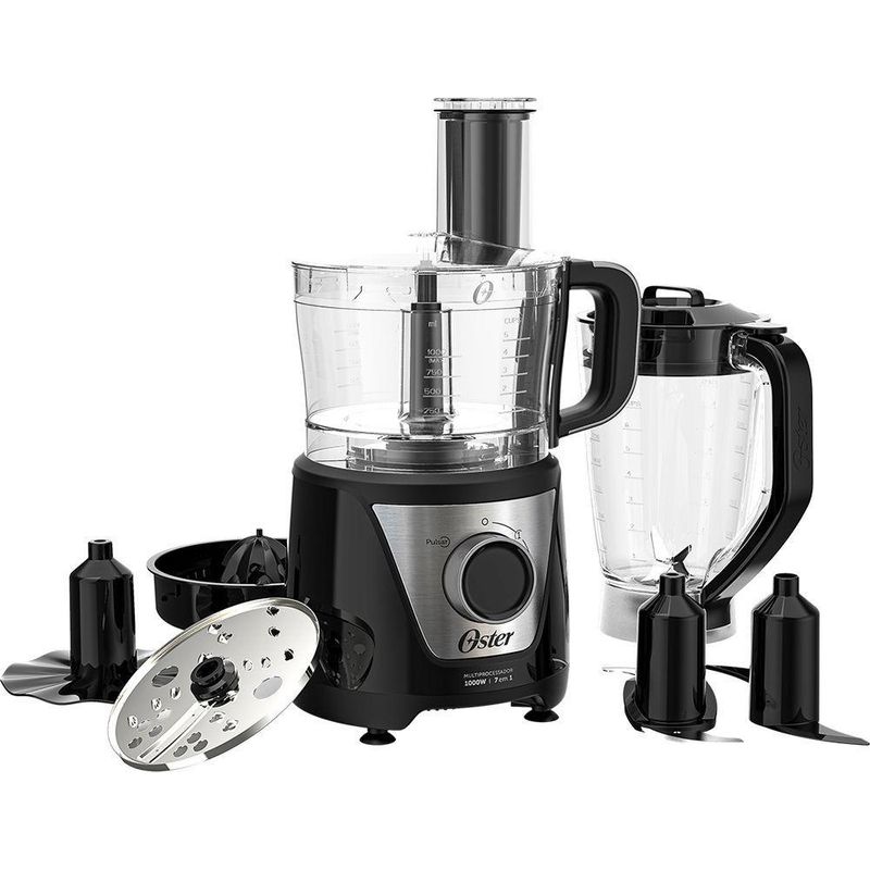Multiprocessador de alimentos Oster Black 7 em 1 OMPR850 220VApresentamos o nosso incrível liquidificador multifuncional com lâminas de aço inoxidável de alta qualidade, este liquidificador oferece desempenho excepcional e durabilidade superior.Suas características incluem um fácil encaixe de acessórios, garantindo uma troca rápida e simples entre as funções de processamento. A base antiderrapante proporciona estabilidade durante o uso, enquanto o painel em inox confere um toque de elegância ao design.Com duas velocidades e a função pulsar, você pode controlar o processo de mistura de acordo com suas preferências. Além disso, uma trava de segurança garante tranquilidade durante o uso.Este liquidificador vem acompanhado de uma variedade de acessórios, incluindo uma jarra de 1,5 litros para preparar sucos, cremes e triturar gelo. As lâminas em aço inoxidável são ideais para processar, picar e triturar alimentos diversos. Também estão inclusos discos fatiador e ralador, proporcionando ainda mais versatilidade às suas receitas.Com este liquidificador multifuncional, você terá tudo o que precisa para preparar uma ampla variedade de pratos de forma rápida, eficiente e com resultados incríveis. Simplifique sua vida na cozinha com o nosso liquidificador de alto desempenho.Especificações Técnicas:Marca: OsterModelo: OMPR850-220Voltagem: 220VPotência: 1000WConsumo: 1kWhCapacidade: 1LMaterial da lâmina: Aço InoxFunções: Fácil encaixe de acessórios, base antiderrapante, painel em inox, 2 velocidades e pulsar, trava de segurançaAcessórios: Jarra de Liquidificador de 1,5L: sucos, cremes e triturar ,gel,Lâminas em Aço Inox: processam, picam e trituram os alimentos,Disco Fatiador - Lado 1,Disco Ralador - Lado 2,Espremedor de Frutas,Disco Emulsificador,Lâmina de Massas,Dimensões do Produto: 25,6 L x 44,8 A x 19,6 P cmDimensões do Produto Embalado: 45,5 L x 34,5 A x 20 P cmPeso do Produto: 3,3 KgPeso do Produto Embalado: 3,8 KgGarantia: 12 meses