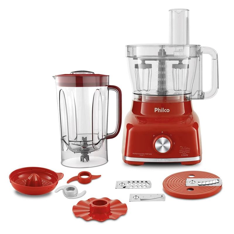 Versatilidade é a principal característica do Multiprocessador de Alimentos Philco. São 3 produtos em 1, ou seja, é liquidificador, processador, espremedor e batedeira, perfeito para o preparo de diversas receitas. Super potente, com 1400W, acompanha 2 velocidades e Função Pulsar para executar múltiplas funções como processar, ralar, cortar, misturar, fatiar, espremer, picar, liquidificar, emulsionar, massas pesadas e massas leves.Com lâminas de aço inox, afiadas e indicadas para cada tipo de receita, é muito mais fácil alcançar o ponto da receita em menos tempo. Para todos os tamanhos de receitas, os copos dos acessórios tem alta capacidade de volume, ideal para todos os tamanhos de pratos. Completo, permite que sua cozinha fique mais equipada, moderna e colorida. O design das peças, na cor vermelho, combina com os transparentes dos copos e trazem a segurança dos pés antiderrapante e travas que auxiliam no funcionamento correto do produto. Desperte a vontade de criar novas receitas e ganhe mais sabor em seus dias.