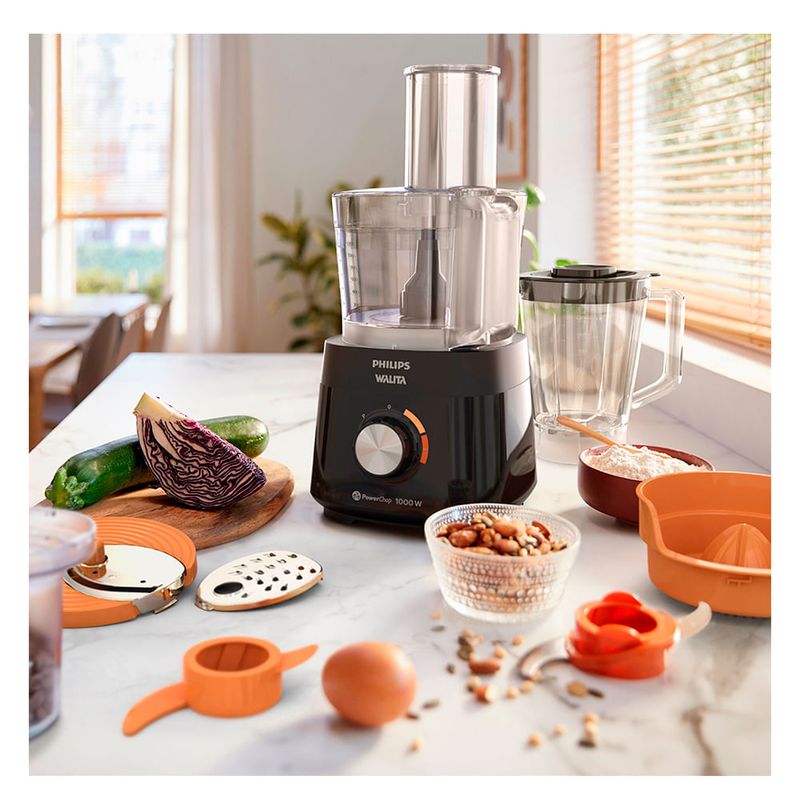 Conheça o Multiprocessador PowerChop com versatilidade power para suas receitas darem sempre certo.São 1000W com 2 velocidades, mais pulsar. Função siga as cores para selecionar a velocidade pela cor dos acessórios, de forma simples e intuitiva! Jarra do Multiprocessador de 1,5L, com tampa medidora. 6 acessórios: Jarra de liquidificador 2L*, Lâmina para ralar e fatiar, Moedor de grãos, Espremedor de frutas, Batedor de massas, e Faca processadora PowerChop, exclusiva tecnologia que combina 2 lâminas com ângulos de corte perfeito, muito mais fino e preciso. Assim é possível preparar diversas receitas. Totalmente livre de BPA. Cabo retrátil, compacto e fácil de armazenar. Experimente fazer sempre o seu melhor com Philips Walita! *Capacidade útil da jarra do liquidificador: 1,5 litros. CaracterísticasTipo: MultiprocessadorVelocidades: 02 + pulsarCapacidade da Jarra: 1,5 LitrosFunções: 6 funções, processa, ralar, moedor de grãos, espremedor, batedor de massas e liquidificaCopo DesmontávelBatedor de Massa/ClarasHaste Destacável Especificações TécnicasModelo: HR7304Comprimento do Fio: 80 cmPotência: 1000 WConsumo de Energia: 1,0 kwh/mesVoltagem: 110V / 220V (não é bivolt)Cor: PretoEAN: 8720389031854 (110) / 8720389031861 (220V)Garantia: 24 meses Dimensões e PesoDimensões do produto sem embalagem (AxLxP): 393x194x212 mmDimensões do produto com embalagem (AxLxP): 327x255x377 mmPeso do produto sem embalagem: 1,82 KgPeso do produto com embalagem: 4,01 Kg Itens Inclusos01 Unidade Motora01 Jarra de Processador01 Tampa01 Faca Processadora01 Jarra de Liquidificador01 Lâmina de Ralar e de Fatiar01 Moedor01 Espremedor01 Batedor de Massas01 Manual 01 Certificado de Garantia Certificação InmetroProduto possui certificação de segurança compulsória, certificado pela UL-BR 21.1538, organismo acreditado pela CGCRE do Inmetro.