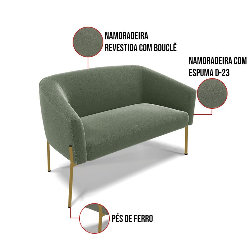 Tem novidades chegando por aqui! Olha só essa nossa inéditaNamoradeira e 2 Poltronas Stella Bouclê. Sim, as melhores opções em Namoradeira estão aqui! A Namoradeira e 2 Poltronas Stella Bouclê é para todas as ocasiões, é ideal para você relaxar, assistir tv ou ler um livro, mantendo-o confortável ao longo do dia! Um estofado versátil, que foge do convencional pelo seu design e tecido luxuoso. Seu formato curvo, marcante e sofisticado, oferece conforto de forma excepcional, com aquela sensação de abraço, que deixa o coração quentinho! Desenvolvida com atenção aos detalhes, para atender todas suas expectativas e necessidades. Seu aspecto arredondado e anatômico, possibilita que a postura fique sempre alinhada, mantendo a coluna na posição correta. Ela dispõe de um acabamento impecável, revestida em Bouclê em tom Verde Pistache, um tecido maleável que além de ser muito bonito, é a grande tendência do momento, por ser uma lã mais refinada, quente, com toque suave e agradável, semelhante à textura natural da ovelha. Contém uma estrutura robusta, sua sustentação é dada pelos Pés de Ferro no tom Dourado, que garantem mais segurança e firmeza ao sentar-se. Já o enchimento é feito em espuma D-23 no encosto e assento, garantindo maior conforto ao usuário. Ah! Vale a pena lembrar que a Namoradeira e 2 Poltronas Stella Bouclê, foi produzida em quantidades limitadas, para aqueles que procuram criar um visual diferenciado e exclusivo. Então, não deixe de aproveitar esse lançamento, hem! Leve a sua agora mesmo. Dimensões da Poltrona: Altura Total: 81 cm Largura Total: 77 cm Profundidade Total: 60 cm Altura do Encosto: 40 cm Largura do Assento: 45 cm Profundidade do Assento: 45 cm Altura do chão ao Assento: 45 cm Espessura do Assento: 15 cm Espessura do braço: 7 cm Altura do chão ao braço: 70 cm Altura interna do braço: 28 cm Tamanho dos pés: 30 cm Peso: 17 kg Dimensões da Namoradeira: Altura Total: 81 cm Largura Total: 127 cm Profundidade Total: 60 cm Altura do Encosto: 40 cm Largura do Assento: 95 cm Profundidade do Assento: 45 cm Altura do chão ao Assento: 45 cm Espessura do Assento: 15 cm Espessura do braço: 7 cm Altura do chão ao braço: 70 cm Altura interna do braço: 28 cm Tamanho dos pés: 30 cm Peso: 25 kg Especificações do Produto: Estrutura: Madeira Eucalipto Espuma: D-23 Tecido: Bouclê Peso Suportado: Até 120 Kg Tipo de Pés: Pés de Ferro Lateral Dourado Tipo de Encosto: Fixo Tipo de Assento: Fixo Complexidade da Montagem: Baixo Montagem: O produto vai montado, apenas parafusar a base Garantia: 90 dias contra defeito de fabricação Instruções de Limpeza: Utilizar um pano limpo e levemente úmido Você irá Receber: 01 Sofá Namoradeira e 02 Poltronas - Entregue em: 03 Volumes