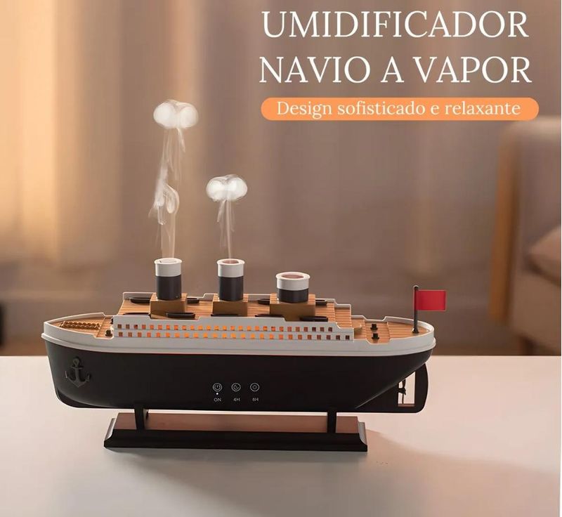 Navio Difusor Umidificador Ar Aromatizador Luzes ColoridasTransforme seu ambiente com o Umidificador Navio a Vapor, um modelo inovador que combina umidificação, aromaterapia e iluminação LED para proporcionar conforto e bem-estar. Seu design elegante inspirado em navios a vapor traz um toque sofisticado à decoração, tornando-o perfeito para quartos, salas, escritórios e espaços relaxantes.CORRENTE ENTRADA: 5vDIFUSOR DE AROMAS: Adicione óleos essenciais para um ambiente perfumado e relaxante.CONTROLE REMOTO: Ajuste as funções sem precisar se levantar, proporcionando mais comodidade.ILUMINAÇÃO LED: Luz suave com várias opções de cores e aconchegante para um clima tranquilo e decorativo.SILENCIOSO E EFICIENTE: Ideal para uso noturno, sem ruídos incômodos.TAMANHO E PESO COMPACTO: Dimensões de 30cm x 14cm, 420 gramas perfeito para qualquer espaço.CONTEÚDO DA EMBALAGEM: Umidificador de ar navio, controle remoto sem fio e Cabo de força.Melhore a qualidade do ar, reduza a secura e crie um ambiente mais aconchegante com este umidificador exclusivo!