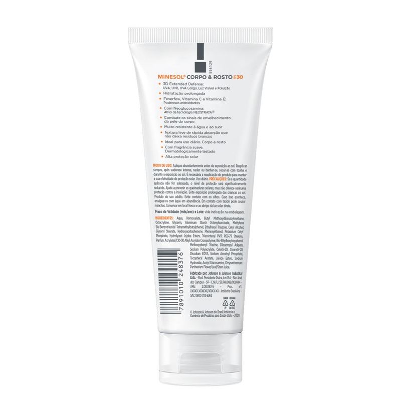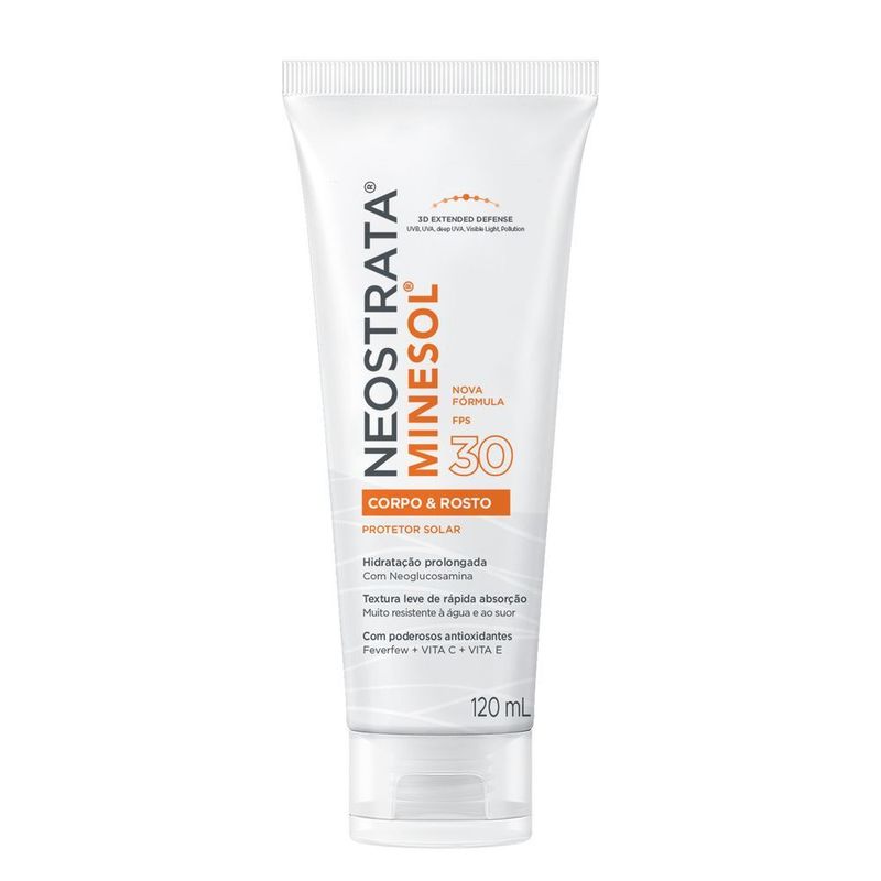 Neostrata Minesol Corpo e Rosto FPS 30 120ml O que é? O Neostrata Minesol Corpo e Rosto FPS 30 é um protetor solar multifuncional, desenvolvido para oferecer proteção eficaz contra os danos solares tanto na pele do rosto quanto do corpo. Sua fórmula leve e de rápida absorção é ideal para o uso diário, garantindo conforto e segurança na exposição ao sol. Para que serve? Proporciona proteção contra os raios UVA e UVB, prevenindo o envelhecimento precoce da pele e reduzindo o risco de câncer de pele. Hidrata a pele enquanto a protege, evitando a ressecamento. É adequado para todos os tipos de pele, incluindo pele sensível. Ajuda a manter a pele com aparência saudável e radiante. Como funciona Formulado com ingredientes que oferecem proteção solar eficaz e ação hidratante, o Neostrata Minesol atua como uma barreira contra os raios nocivos, mantendo a pele hidratada e protegida ao mesmo tempo. Como usar Aplique generosamente sobre a pele limpa e seca do rosto e corpo 30 minutos antes da exposição solar. Para resultados ideais, reaplique a cada 2 horas e sempre que necessário, especialmente após nadar ou suar. Precauções e armazenamento Evite o contato com os olhos; caso isso ocorra, enxágue imediatamente com água. Descontinue o uso em caso de irritação ou reação alérgica. Armazene em local fresco e seco, longe da luz solar direta.