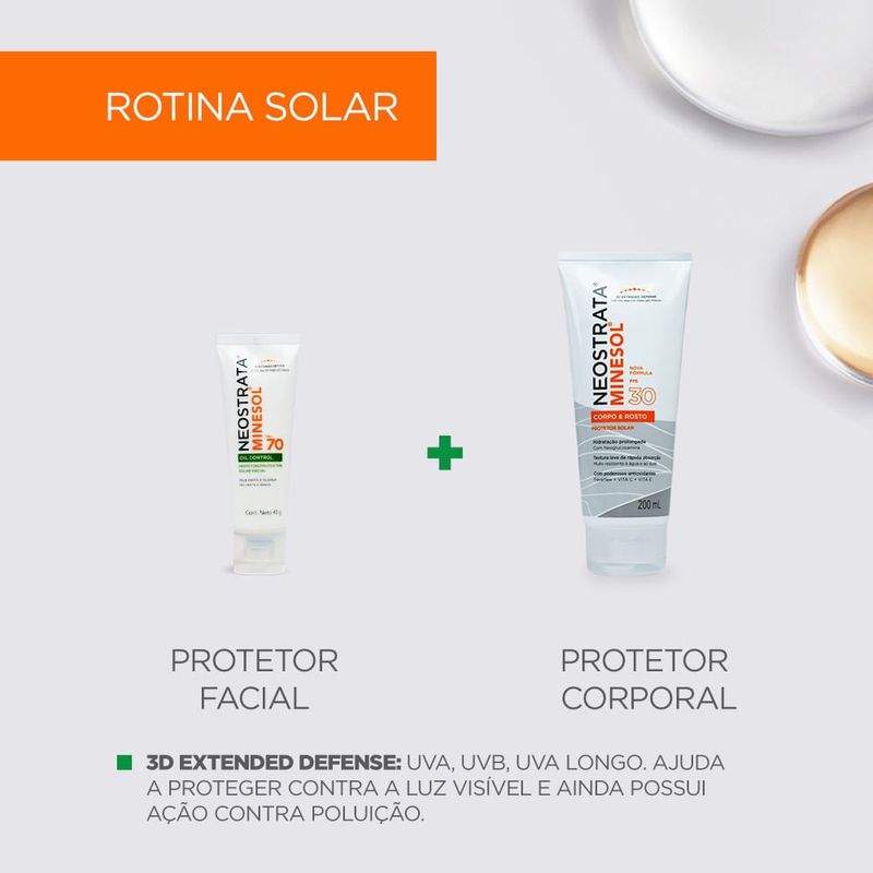 Neostrata Minesol Corpo e Rosto FPS30 200ml O que é? O Neostrata Minesol Corpo e Rosto FPS 30 é um protetor solar de alta performance, especialmente formulado para proteger a pele do rosto e do corpo contra os danos causados pelos raios solares. Com uma textura leve e de rápida absorção, é ideal para uso diário, promovendo conforto sem deixar resíduos. Para que serve? Protege a pele contra os raios UVA e UVB, prevenindo o envelhecimento precoce e minimizando o risco de câncer de pele. Hidrata profundamente, mantendo a elasticidade e a suavidade da pele. Indicado para todos os tipos de pele, incluindo as mais sensíveis. Melhora a aparência da pele, conferindo um aspecto saudável e radiante. Como funciona A fórmula avançada do Neostrata Minesol combina filtros solares eficazes com ingredientes hidratantes, formando uma barreira que protege e nutre a pele, garantindo uma proteção prolongada durante a exposição ao sol. Como usar Aplique o produto generosamente na pele limpa e seca do rosto e corpo 30 minutos antes da exposição solar. Para manter a proteção, reaplique a cada 2 horas, ou sempre que necessário, especialmente após nadar ou suar. Precauções e armazenamento Evite o contato com os olhos; se ocorrer, enxágue abundantemente com água. Suspenda o uso em caso de irritação ou reações alérgicas. Armazene em local fresco, seco e longe da luz solar direta.