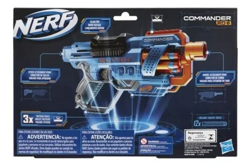Lançador Nerf Elite 2.0 Comander RD-6 – Tambor Giratório - Hasbro A aventura sobe de nível com os lançadores Nerf Elite 2.0, que apresentam recursos de personalização integrados para que se possa utilizar acessórios e sair na frente na aventura Nerf. É hora de montar seu próprio lançador Elite 2.0 para otimizar sua estratégia de jogo e trazer desempenho tático e flexibilidade a todas as aventuras! O lançador Nerf Elite 2.0 Commander RD-6 possui 3 trilhos táticos, encaixe para tubo frontal e encaixe para apoio para personalizar o lançador nas aventuras Nerf. O lançador possui um tambor giratório para 6 dardos, sendo possível lançar um dardo por vez ou em sequência rápida. Tubo frontal e apoio não incluídos. Inclui 12 dardos oficiais Nerf Não requer pilhas.Basta puxar o carregador, apertar a alavanca de disparo e lançar 1 dardo. Pode-se lançar 6 dardos sucessivos mantendo-se a alavanca de disparo pressionada e movendo o carregador ao mesmo tempo. Alcance de ate 21 metros. Idade acima de 8 anos Contem 1 lançador e 12 dardos Tamanho da embalagem 37 x 24 x 7 cm Fabricante Hasbro