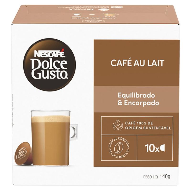 Nescafé DOLCE GUSTO Au Lait 160g com 10 Cápsulas Desfrute do sabor equilibrado e encorpado do NESCAFÉ Dolce Gusto Café Au Lait. Preparado com grãos robusta selecionados e 100% de origem sustentável, este café combina a intensidade do espresso com a suavidade do leite, criando uma bebida cremosa e deliciosa.Quantidade: 10 cápsulasPeso líquido: 140gSabor: Café com leite (Café Au Lait)Características: Café equilibrado e encorpado Grãos robusta selecionados 100% de origem sustentável Compatível com máquinas NESCAFÉ Dolce GustoIdeal para começar o dia ou para uma pausa saborosa a qualquer hora. Aproveite a praticidade das cápsulas e prepare sua bebida favorita em segundos!