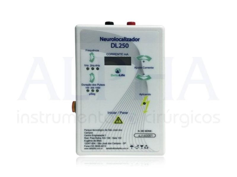 Neurolocalizador DL250 vet O Neurolocalizador DL250 DeltaLife tem a função de localizar unidades nervosas na aplicação da anestesia local no paciente. Estimula-se os nervos periféricos por meio de um impulsos de corrente elétrica através de uma agulha. O Neurolocalizador foi desenvolvido e fabricado totalmente no Brasil, é um equipamento de alta tecnologia e precisão, exclusivo para a área veterinária. Ajuste da Corrente: Por meio dos botões “crescente” e “decrescente”, ajusta-se a corrente de estimulo, dando valores a partir de 0,05mA até 5,00mA, em etapas de 0,05mA; Aplicando(LED): A Luz de LED pisca conforme o Pulso de estímulo; Duração do Pulso: Por meio do Botão pode ser selecionado 100 μSeg, 300 μSeg,********μSeg. A Luz de Led acenderá conforme o valor selecionado. Frequência: Por meio do Botão pode ser selecionado 1Hz, 2Hz e 4hz. A Luz de led acenderá conforme o valor selecionado. Display LCD: Mostra as configurações do Ajuste de Corrente e a Corrente aplicada.