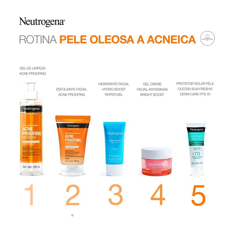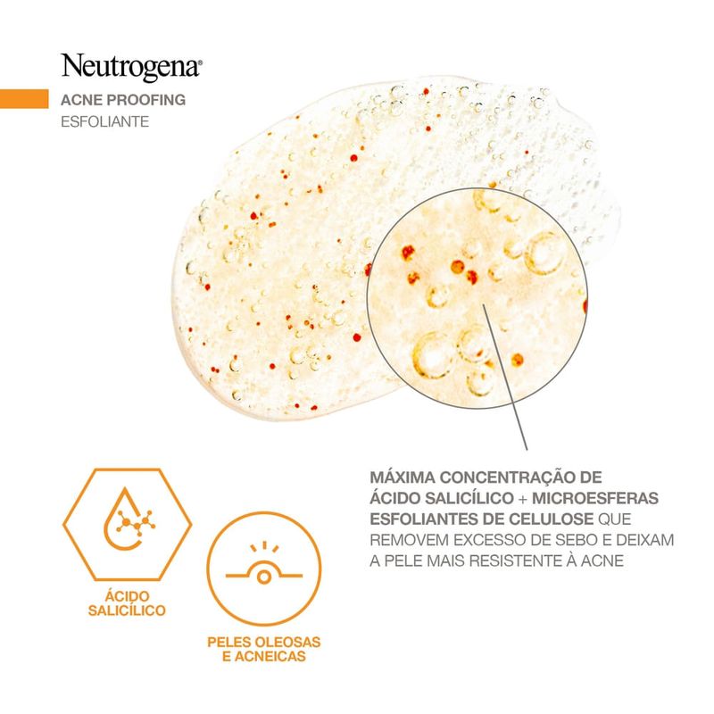 Neutrogena Esfoliante Facial Acne Proofing 100g O Neutrogena Esfoliante Facial Acne Proofing reduz e trata a pele profundamente, desobstruindo os poros e reduzindo os cravos e as espinhas. Limpa sem agredir a barreira natural da pele, estimulando a construção de um escudo natural que previne novas crises de acne. Recomendado para todos os tipos de pele, inclusive as mais oleosas.Modo de Uso:Molhe o rosto e aplique o Neutrogena Esfoliante Facial Acne Proofing massageando suavemente.Enxágue por completo.Indicação :Ideal para peles com tendência à acneAdvertência:Não usar em crianças.Evite contato com os olhos.Caso isso aconteça, enxágue-os com água em abundância.O uso deste produto combinado com medicamentos tópicos contra acne pode aumentar o ressecamento da pele.Se isto ocorrer, procure orientação médica.