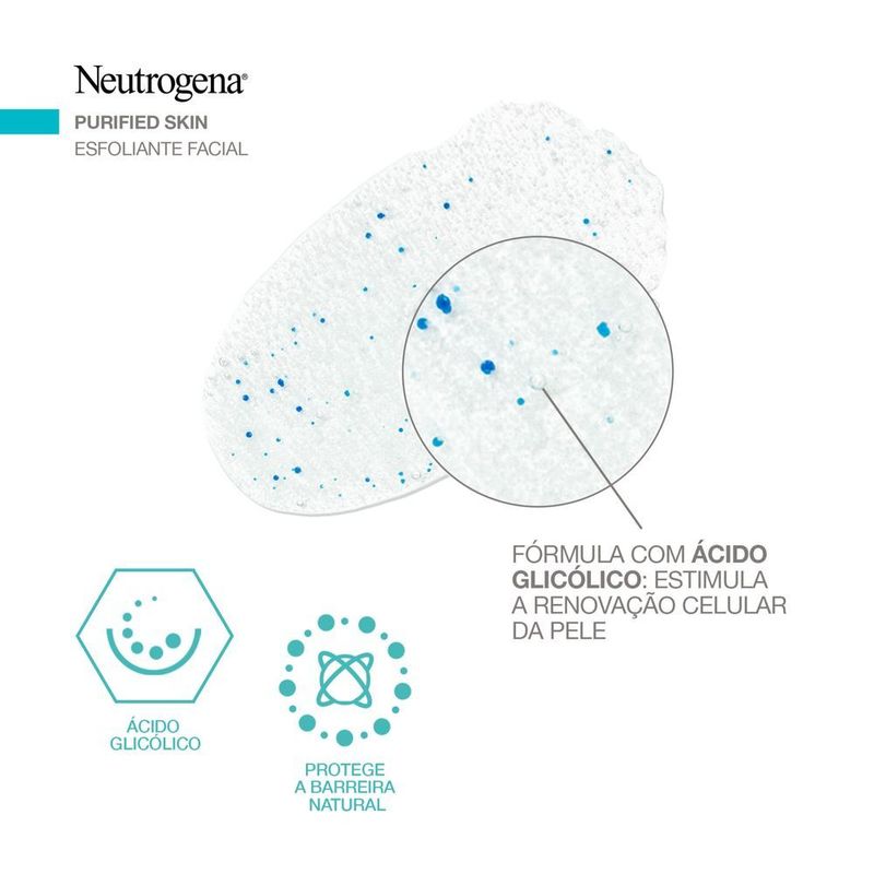 O esfoliante Neutrogena Purified Skin oferece uma limpeza purificante e profunda que elimina as impurezas e toxinas da pele, desobstrui os poros e reduz a oleosidade da pele, sem deixar a sensação de ressecamento. O esfoliante proporciona uma sensação de pele radiante e suave; sua fórmula contém a tecnologia barriercare que preserva a barreira natural da pele e ácido glicólico que promove a renovação celular. O uso do esfoliante Neutrogena Purified Skin permite a desobstrução dos poros, eliminação das impurezas e toxinas e redução da oleosidade da pele com o uso contínuo.