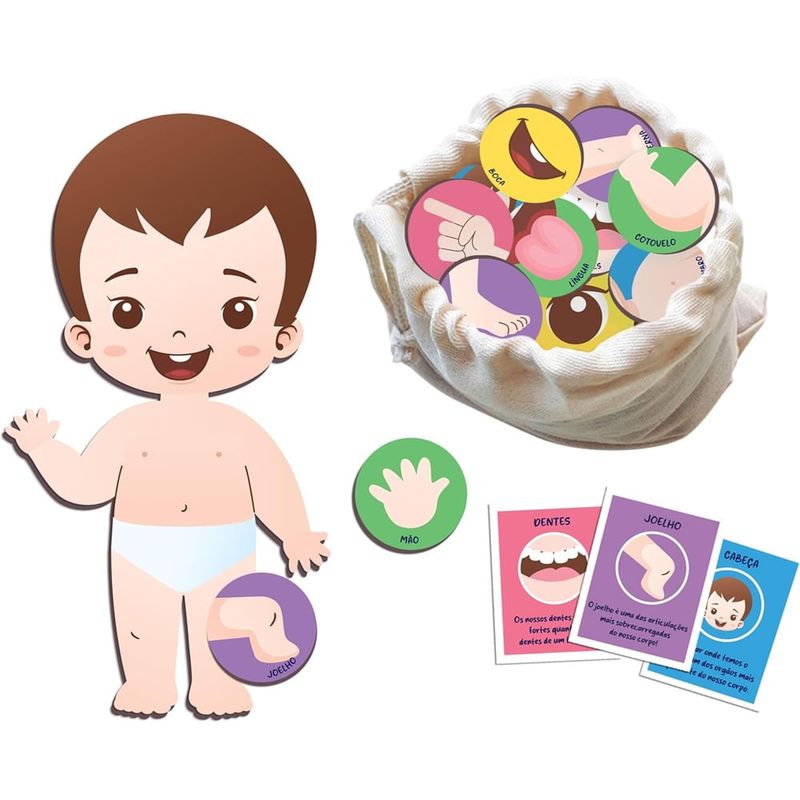Nig Brinquedos Brinquedo Educativo Cadê o Seu Pé O Brinquedo Educativo Cadê o Seu Pé da Nig Brinquedos é uma forma lúdica e interativa de ensinar as crianças a reconhecer e nomear as partes do corpo. Com peças grandes, coloridas e resistentes, este jogo estimula a coordenação motora, a percepção visual e o aprendizado de maneira divertida e envolvente. Indicado para crianças a partir de 3 anos, o jogo consiste em identificar partes do corpo no próprio corpo da criança e posicioná-las sobre o boneco de madeira. Acompanha 21 peças grandes em madeira reciclada, 01 boneco grande, 20 cartas ilustradas e 01 saquinho de tecido para guardar o material, tornando-o prático e durável. 21 peças grandes e coloridas confeccionadas em madeira reciclada 01 boneco de madeira grande para interatividade 20 cartas ilustradas para dinamizar o jogo 01 saquinho de tecido para armazenar as peças Material resistente e acabamento de alta qualidade Benefícios Educativo: Ensina as partes do corpo de forma clara e divertida. Pedagógico: Estimula coordenação motora, percepção e linguagem. Sustentável: Produzido em madeira reciclada, contribuindo para o meio ambiente. Resistente: Peças grandes e seguras para crianças. Incentiva interação e aprendizado espontâneo. Modo de Uso Escolha uma carta, identifique a parte do corpo representada e aponte no seu próprio corpo. Em seguida, posicione a peça correspondente no boneco de madeira. Pode ser jogado individualmente ou em grupo. Precauções e Advertências Indicado para crianças a partir de 3 anos. Utilizar sempre sob supervisão de um adulto. Contém peças que podem ser engolidas. Evitar contato com água para preservar o material.