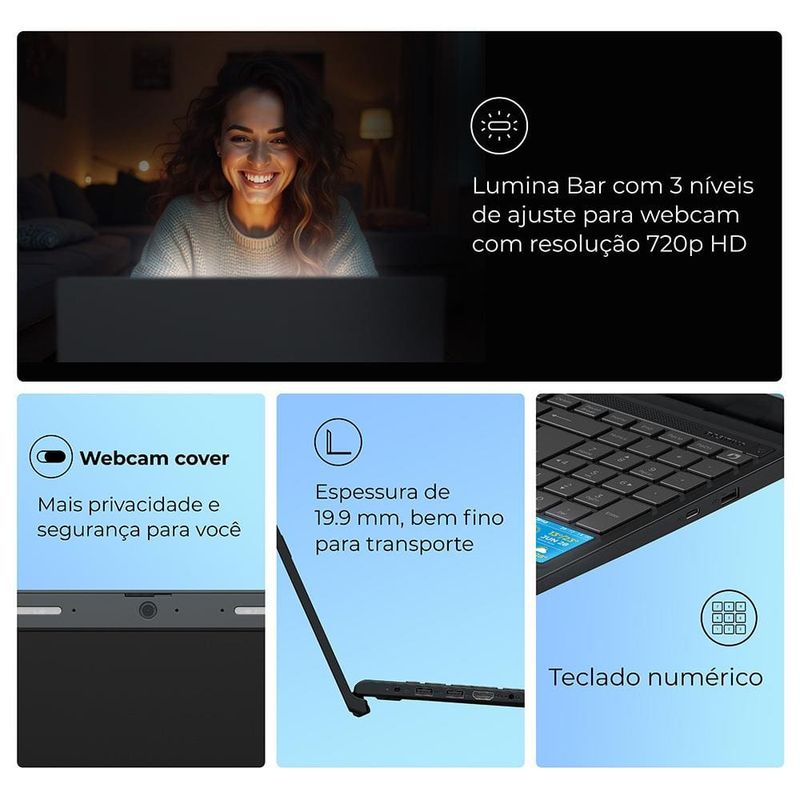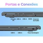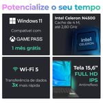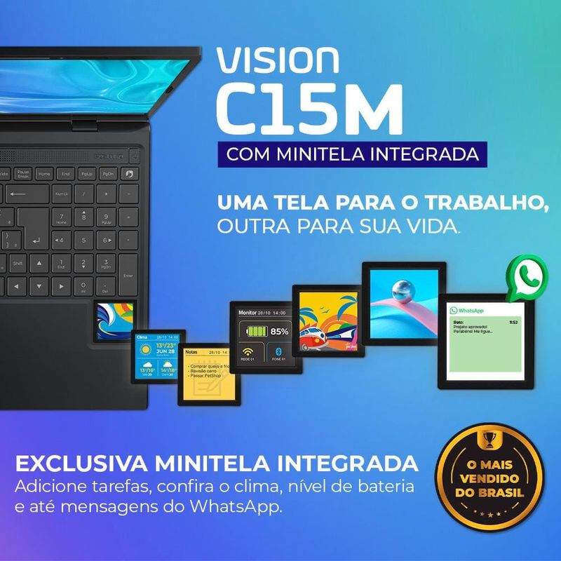 Notebook 15.6” Positivo Vision C15M: para trabalhar, estudar e se divertir! O Notebook Positivo Vision C15M 15.6” Full HD: Equipado com processador Intel Celeron N4500 e o Vision C15M oferece o melhor desempenho para estudos, navegação e tarefas de escritório. Armazenamento e MemóriaO armazenamento de 128GB eMMC e memória RAM de 4GB garantem inicialização rápida e espaço eficiente para seus arquivos.Tela e Minitela A tela LED Full HD IPS de 15.6” antirreflexo proporciona imagens nítidas e confortáveis, ideal para longas horas de uso. Minitela que permite personalização: Visualize mensagens do WhatsApp, confira informações do clima, lembretes e anotações e até o status do seu notebook. Diversas funções para aumentar sua produtividade!MIAA MIA (Minha Inteligência Artificial) foi desenvolvida pela Positivo para facilitar o acesso à tecnologia de inteligência artificial, auxiliando nas tarefas do dia a dia. Funciona exclusivamente no sistema Windows 11.WebcamConta ainda com Bluetooth 5.0, portas USB 3.2 e HDMI, além de webcam HD 720p para videochamadas com qualidade. BateriaSua bateria de 37Wh oferece autonomia de até 5 horas, acompanhando você em qualquer rotina. Tela LED 15.6” Full HD (1920×1080) IPS Antirreflexo Processador Intel Celeron N4500 (Cache 4MB) Sistema Operacional Windows 11 Home Memória RAM 4GB DDR4 Armazenamento 128GB eMMC Placa de vídeo Integrada: Intel Graphics Bluetooth 5.0 Com design leve e acabamento cinza, o notebook é perfeito para quem busca mobilidade e estilo. Descubra mais produtos com a inovação e tecnologia Positivo!