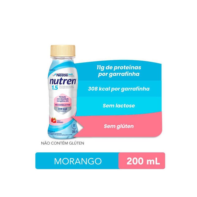 Nutrição Enteral e Oral Nutren 1.5 Morango 200ml Para que serve o Nutrição Enteral e Oral Nutren 1.5 Morango 200ml? O Nutrição Enteral e Oral Nutren 1.5 Morango 200ml é um suplemento nutricional completo e balanceado, ideal para pacientes que necessitam de um suporte nutricional extra, seja por via enteral ou oral. Com sabor de morango, essa fórmula de alta densidade calórica é especialmente indicada para quem precisa de um aporte extra de calorias e nutrientes, ajudando na recuperação, ganho de peso ou manutenção da saúde nutricional. É uma excelente escolha para pessoas com dificuldades de alimentação normal devido a condições clínicas específicas. Como usar o Nutrição Enteral e Oral Nutren 1.5 Morango 200ml? AGITAR BEM ANTES DE USAR. Fórmula comercialmente estéril. Manusear de acordo com as Boas Práticas de Manipulação para evitar contaminação. O Nutren 1.5 pode ser consumido diretamente ou utilizado em nutrição enteral, conforme orientação de um profissional de saúde. É indicado que o consumo seja gradual para garantir o conforto digestivo, respeitando a quantidade recomendada. Ingredientes Água, maltodextrina, sacarose, caseinato de sódio, óleo de canola com baixo teor erúcico, proteína isolada de soja, óleo de milho, caseinato de cálcio, minerais (citrato de potássio, fosfato de cálcio tribásico, cloreto de magnésio, cloreto de potássio, óxido de magnésio, sulfato ferroso, sulfato de zinco, sulfato de manganês, gluconato de cobre, iodeto de potássio, cloreto de cromo, molibdato de sódio, selenito de sódio), vitaminas (bitartarato de colina, L-ascorbato de sódio, acetato de DL-alfa-tocoferila, nicotinamida, cloridrato de cloreto de tiamina, D pantotenato de cálcio, palmitato de retinila, cloridrato de piridoxina, riboflavina, ácido N-pteroil L-glutâmico, fitomenadiona, D-biotina, colecalciferol, cianocobalamina), aromatizantes, emulsificante lecitina de soja, estabilizantes celulose microcristalina, carragena e carboximetilcelulose sódica, regulador de acidez hidróxido de potássio, antiespumante polidimetilsiloxano e corante natural carmim cochonilha. Frase Obrigatória NÃO CONTÉM GLÚTEN. Advertências Uso exclusivo sob orientação médica ou de um nutricionista. Não deve ser utilizado como única fonte de nutrição sem a devida recomendação. Manter em local fresco e seco, protegido da luz solar direta. Após aberto, consumir em até 24 horas. Manter fora do alcance de crianças. ALÉRGICOS: CONTÉM DERIVADOS DE LEITE E SOJA. Principais Benefícios Alta densidade calórica, ideal para suporte nutricional intensivo Fonte de proteínas, carboidratos e gorduras equilibradas Sabor de morango agradável para facilitar o consumo Indicado para pacientes com necessidades nutricionais específicas Fórmula de fácil absorção e adequada para recuperação nutricional NÃO CONTÉM GLÚTEN. Dica Para um consumo mais agradável, experimente servir o Nutren 1.5 Morango gelado. Isso pode tornar o sabor ainda mais refrescante, especialmente para aqueles que consomem o produto diariamente! Informação Nutricional CALORIAS VALOR ENERGETICO 154KCAL ** CARBOIDRATOS CARBOIDRATOS TOTAIS 22G ** ACUCARES TOTAIS 8G ** ACUCARES ADICIONADOS 8G ** LACTOSE 0G ** PROTEINAS PROTEINAS TOTAIS 5,6G ** GORDURAS GORDURAS TOTAIS 4,8G ** GORDURAS SATURADAS 0,6G ** GORDURAS TRANS 0G ** GORDURAS MONOINSATURADAS 2,1G ** GORDURAS POLI-INSATURADAS 1,7G ** OMEGA 6 1,4G ** OMEGA 3 200MG ** COLESTEROL 1,1MG ** FIBRAS FIBRA ALIMENTAR 0G ** VITAMINAS E MINERAIS SODIO 70MG ** VITAMINA A 100MCG ** VITAMINA D 1,4MCG ** VITAMINA E 3,5MG ** VITAMINA E MINERAIS VITAMINA K 17MCG ** VITAMINAS E MINERAIS VITAMINA C 16MG ** VITAMINA B1 0,26MG ** VITAMINA B2 0,24MG ** NIACINA 2,7MG ** ACIDO PANTOTENICO 0,52MG ** VITAMINA B6 0,22MG ** BIOTINA 5MCG ** ACIDO FOLICO 23MCG ** VITAMINA B12 0,5MG ** CALCIO 97MG ** CLORETO 90MG ** COBRE 90MG ** CROMO 5,5MCG ** FERRO 2,2MG ** FOSFORO 85MG ** IODO 21MCG ** MAGNESIO 29MG ** MANGANES 0,4MG ** MOLIBDENIO 12MCG ** POTASSIO 160MG ** SELENIO 7,5MCG ** ZINCO 1,4MG ** COLINA 92MG **