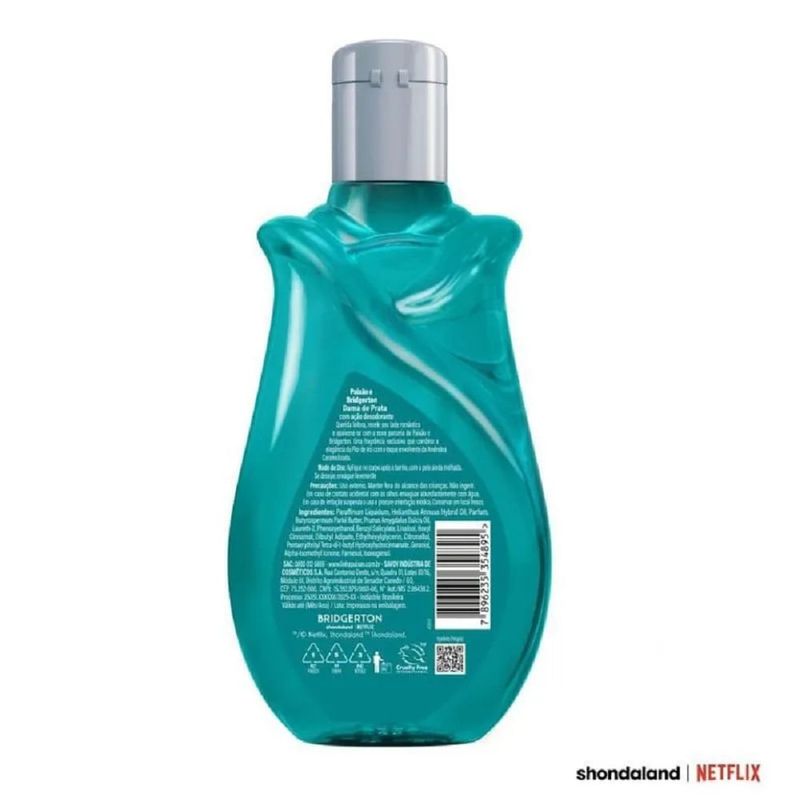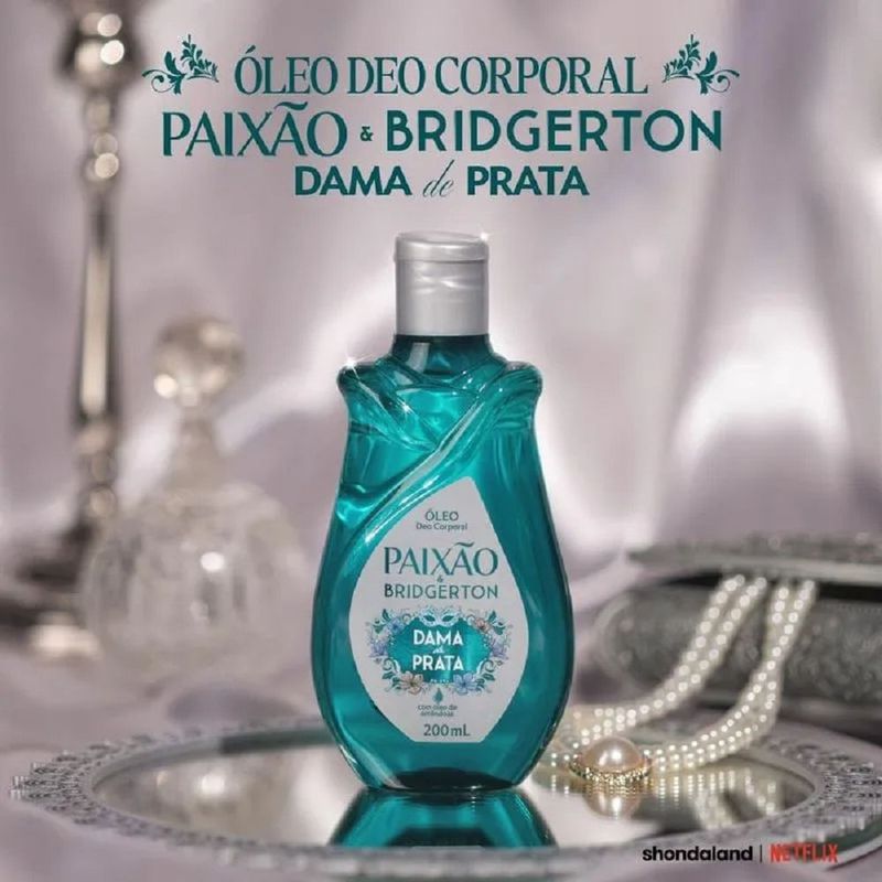 Óleo Corporal Paixão & Bridgerton Dama de Prata com Ação Desodorante 200ml Há aromas que revelam presença, elegância e encantamento desde o primeiro instante. O Óleo Corporal Paixão & Bridgerton Dama de Prata foi desenvolvido para quem deseja uma pele radiante, hidratada e envolvida por uma fragrância sofisticada que permanece ao longo do dia. Com fórmula enriquecida com óleo de amêndoas, ele garante nutrição profunda e hidratação por até 24 horas, deixando a pele macia, luminosa e com toque aveludado. Sua fragrância oriental amadeirada gourmand combina a delicadeza da Flor de Íris com o calor adocicado das Amêndoas Caramelizadas, criando um perfume marcante, inspirado nas tendências da perfumaria fina. Além disso, todos os produtos Paixão possuem o selo Leaping Bunny, garantindo um produto cruelty free e livre de crueldade animal. Descubra a experiência sensorial completa da Edição Especial Limitada Paixão & Bridgerton Dama de Prata. Benefícios Edição Especial Limitada Bridgerton — exclusividade com assinatura elegante. Enriquecido com óleo de amêndoas — nutrição profunda e pele mais macia. Hidratação intensa e prolongada por até 24 horas. Ajuda a manter a barreira cutânea saudável e previne o ressecamento. Perfumação duradoura com notas orientais amadeiradas gourmand. Produto cruelty free, certificado pelo programa Leaping Bunny. Deixa a pele luminosa, com brilho natural e toque acetinado. Informações Adicionais A composição do Dama de Prata garante hidratação intensa sem sensação oleosa ou pegajosa, proporcionando um acabamento elegante e iluminado. Ideal para uso diário, principalmente após o banho, quando a pele está mais receptiva aos ativos nutritivos. Sua fragrância marcante entrega discrição com personalidade — perfeita para quem deseja impressionar com naturalidade. Ingredientes Paraffinum Liquidum, Helianthus Annuus Hybrid Oil, Parfum, Butyrospermum Parkii Butter, Prunus Amygdalus Dulcis Oil, Laureth-2, Phenoxyethanol, Benzyl Salicylate, Linalool, Hexyl Cinnamal, Dibutyl Adipate, Ethylhexylglycerin, Citronellol, Pentaerythrityl Tetra-di-t-butyl Hydroxyhydrocinnamate, Geraniol, Alpha-Isomethyl Ionone, Farnesol, Isoeugenol. Modo de Uso Aplique sobre a pele após o banho, com o corpo ainda úmido. Massageie até completa absorção. Para um toque ainda mais suave, enxágue rapidamente se desejar. Use diariamente para melhores resultados. Precauções Uso externo. Mantenha fora do alcance de crianças. Não indicado para uso infantil. Não ingerir. Evitar contato com os olhos; caso aconteça, enxaguar abundantemente. Não aplicar sobre áreas irritadas ou lesionadas. Se ocorrer irritação, interromper o uso e consultar um profissional de saúde. Conservar ao abrigo de luz e calor excessivo. Não reutilizar a embalagem.